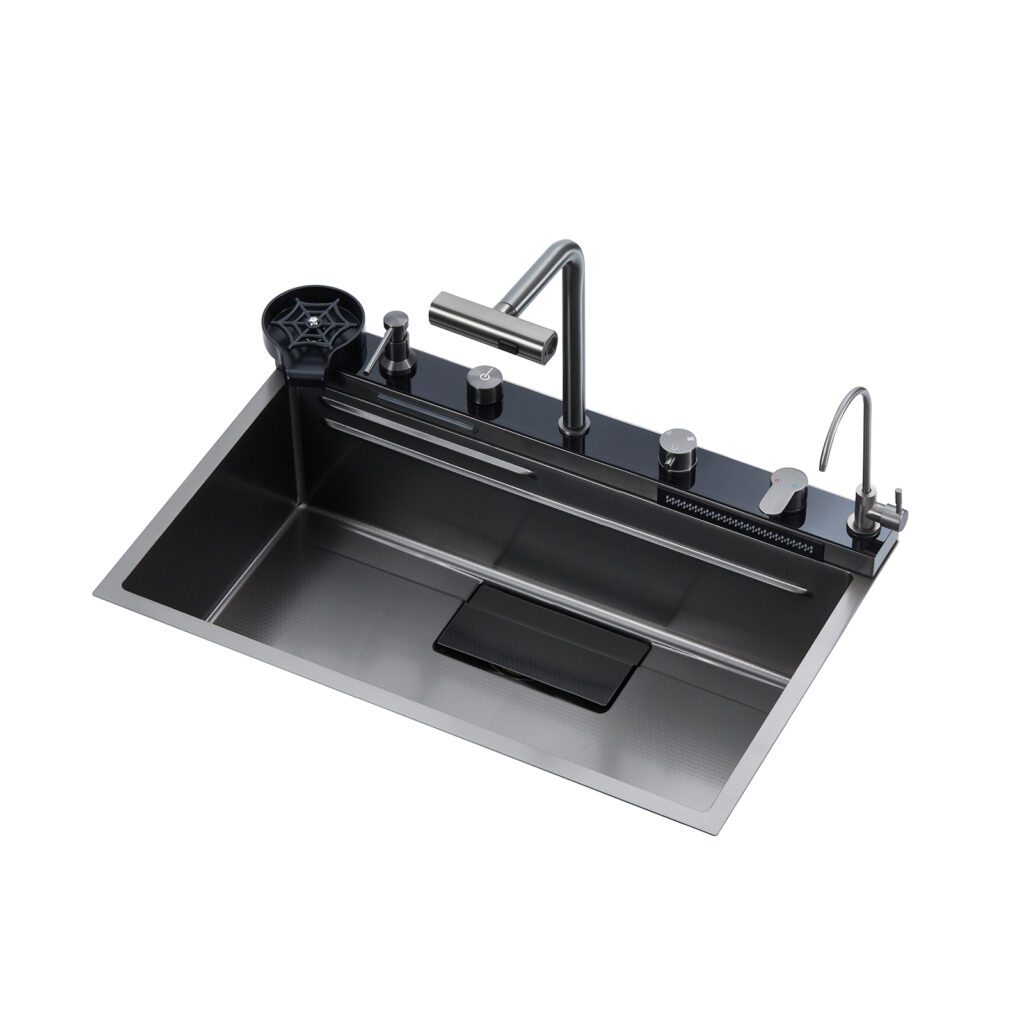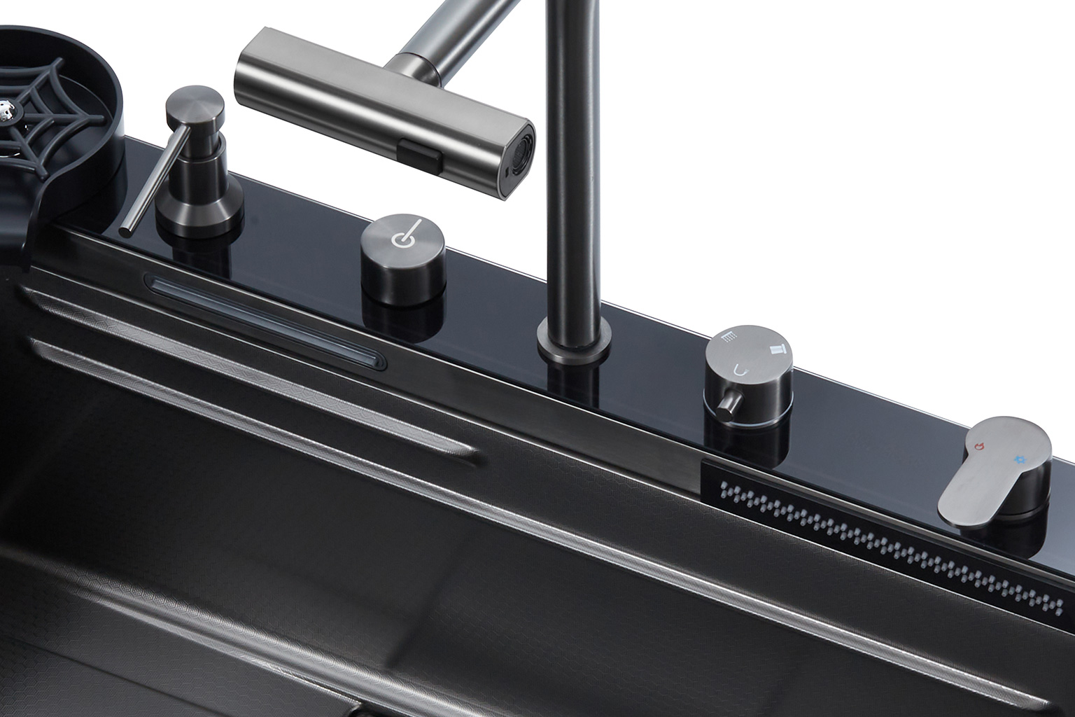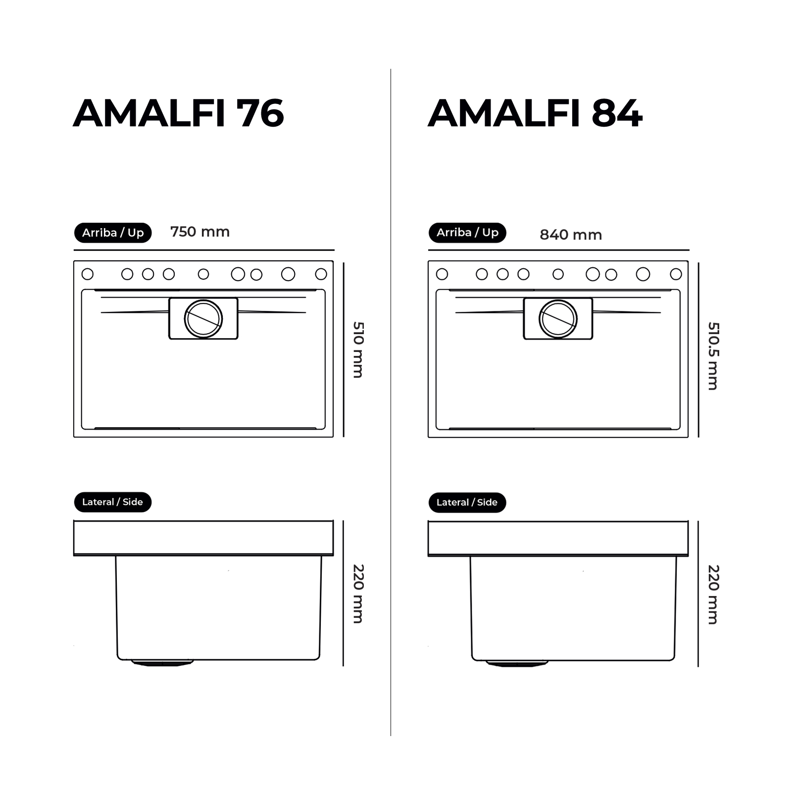 El fregadero AMALFI 76|84 combina una tina amplia en INOX 304 satinado con un sistema de grifería multifuncional para elevar la experiencia de lavado y preparación. Integra controles dedicados, chorros con distintos modos, enjuagador de vaso y accesorios que facilitan la higiene y el orden en la encimera, ideal para una cocina moderna y de uso intensivo.