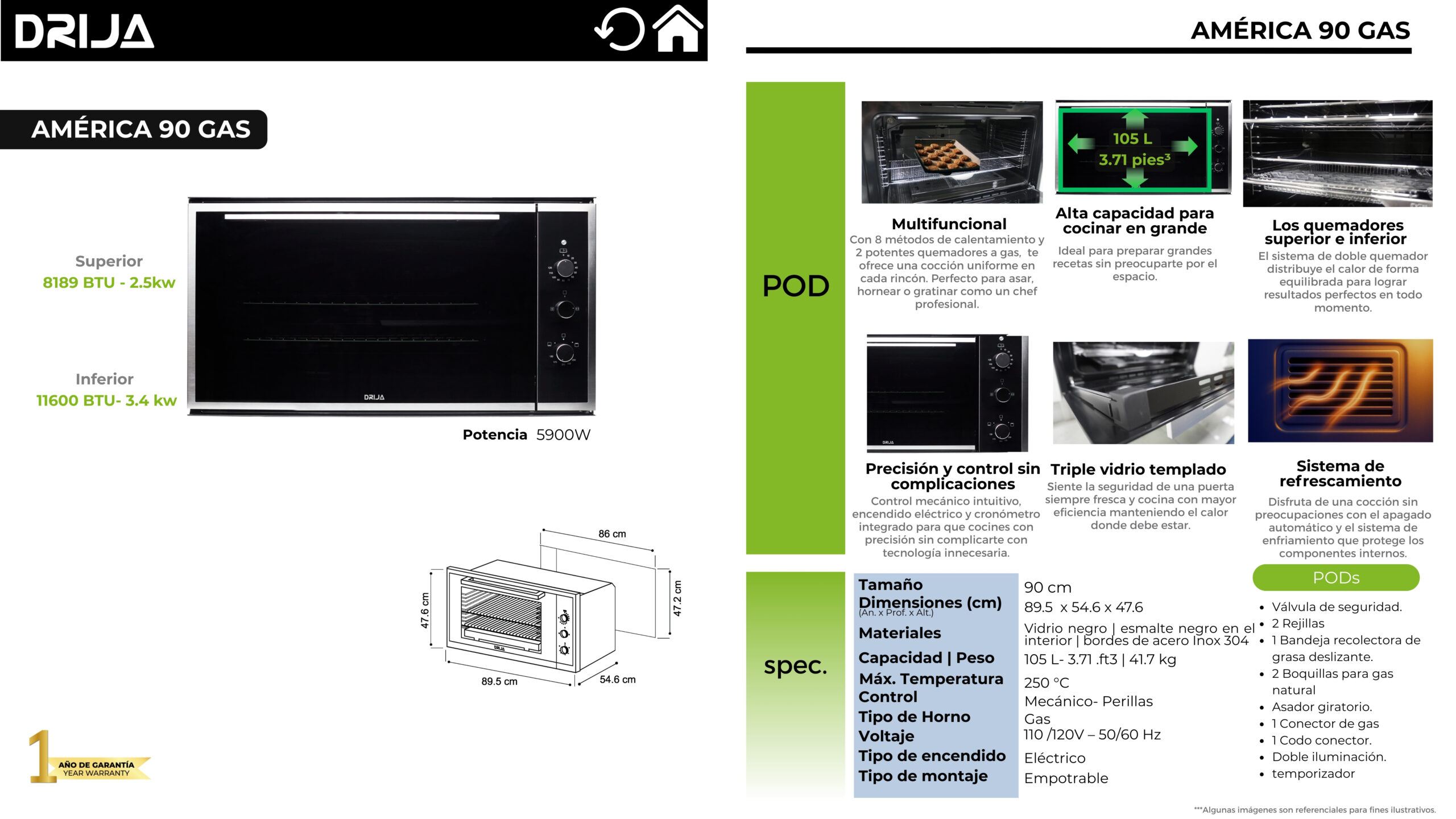 El horno América 90 Gas de Drija está diseñado para quienes cocinan en grande. Con su gran capacidad de 105 L, doble quemador a gas, cronómetro integrado y triple vidrio templado, es perfecto para cocinas exigentes que buscan precisión, potencia y seguridad. Fabricado con materiales de alta gama y pensado para durar.