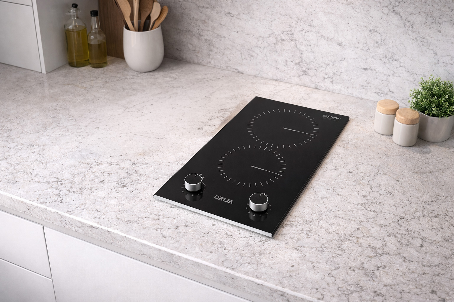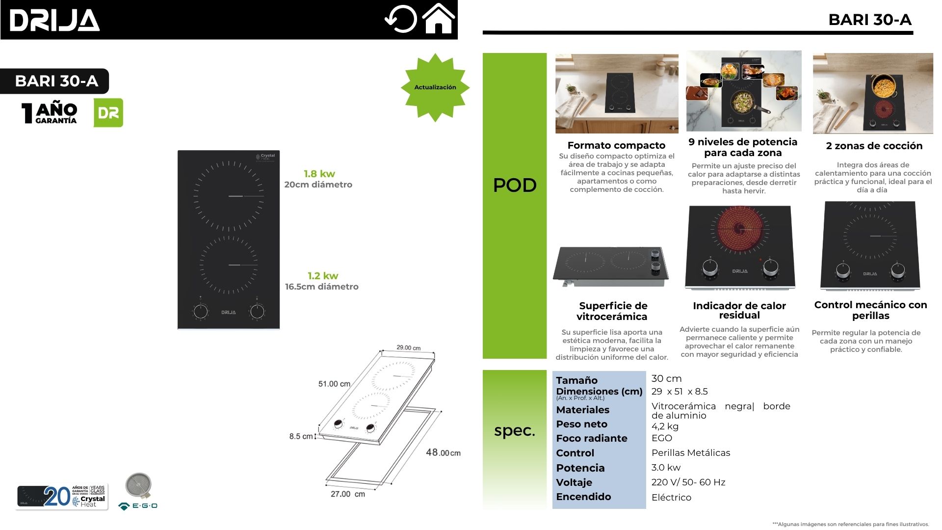 La BARI 30-A es una placa de vitrocerámica compacta de 30 cm, pensada para cocinas modernas donde cada centímetro cuenta. Integra 2 zonas radiantes EGO (1.8 kW de 20 cm y 1.2 kW de 16.5 cm) para cubrir desde cocciones rápidas hasta preparaciones suaves, con una potencia total de 3.0 kW. Su superficie de vitrocerámica negra con borde de aluminio aporta un look limpio y resistente, mientras el control mecánico con perillas metálicas asegura un manejo clásico, directo y confiable. Además, suma seguridad real con protección automática contra sobrecalentamiento e indicador de calor residual para evitar contactos accidentales cuando la zona sigue caliente.