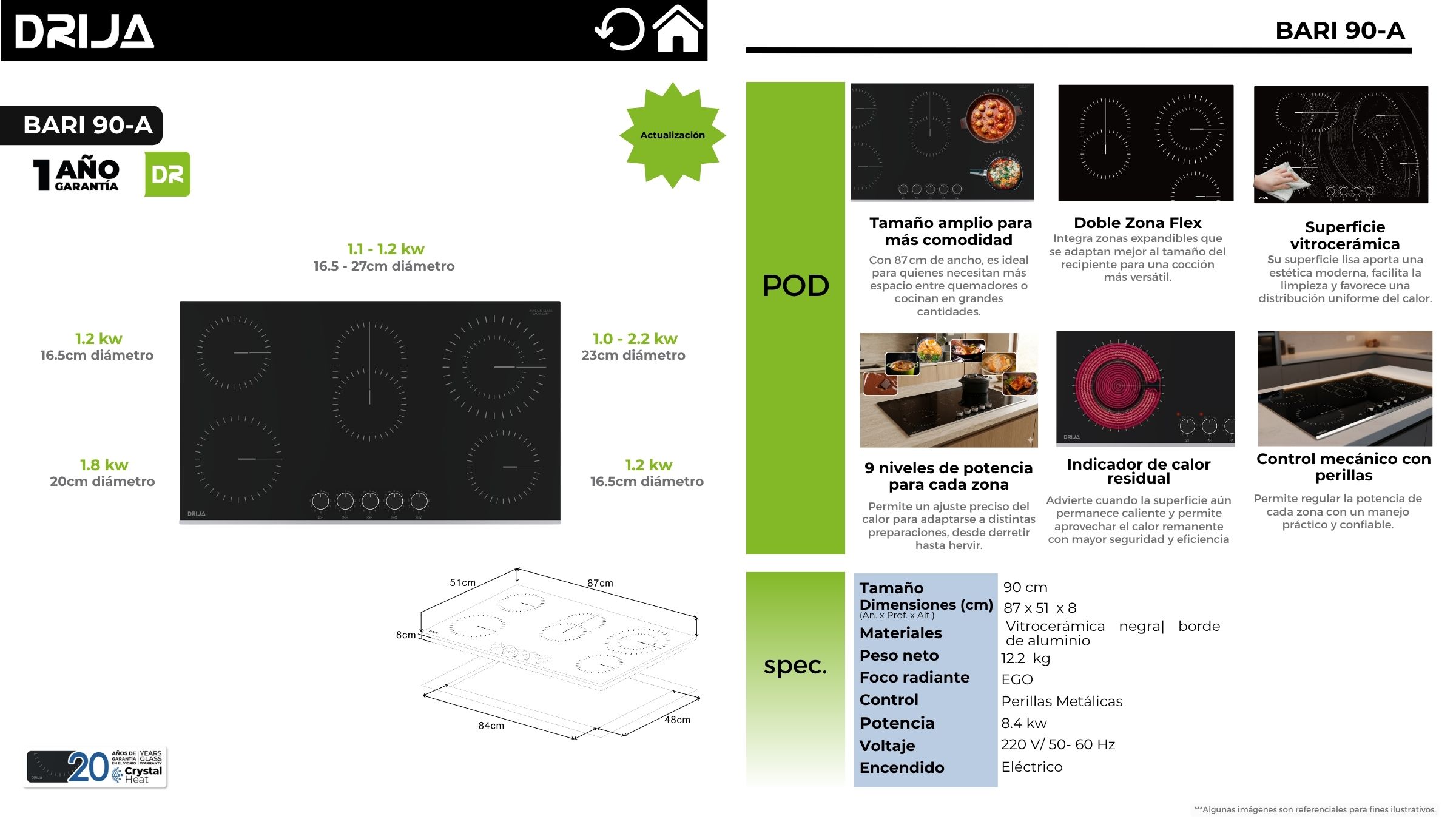 La BARI 90-A es una cocina eléctrica vitrocerámica de 90 cm diseñada para cocinas amplias que necesitan más espacio y libertad de movimiento. Integra 5 zonas de cocción EGO (incluida Zona Flex) y control mecánico con perillas metálicas, logrando un manejo clásico, preciso y confiable. Su superficie vitrocerámica negra se ve elegante, se limpia rápido y está pensada para el uso diario, con 9 niveles de potencia por zona y una potencia total de 8.4 kW para cocinar con ritmo profesional.