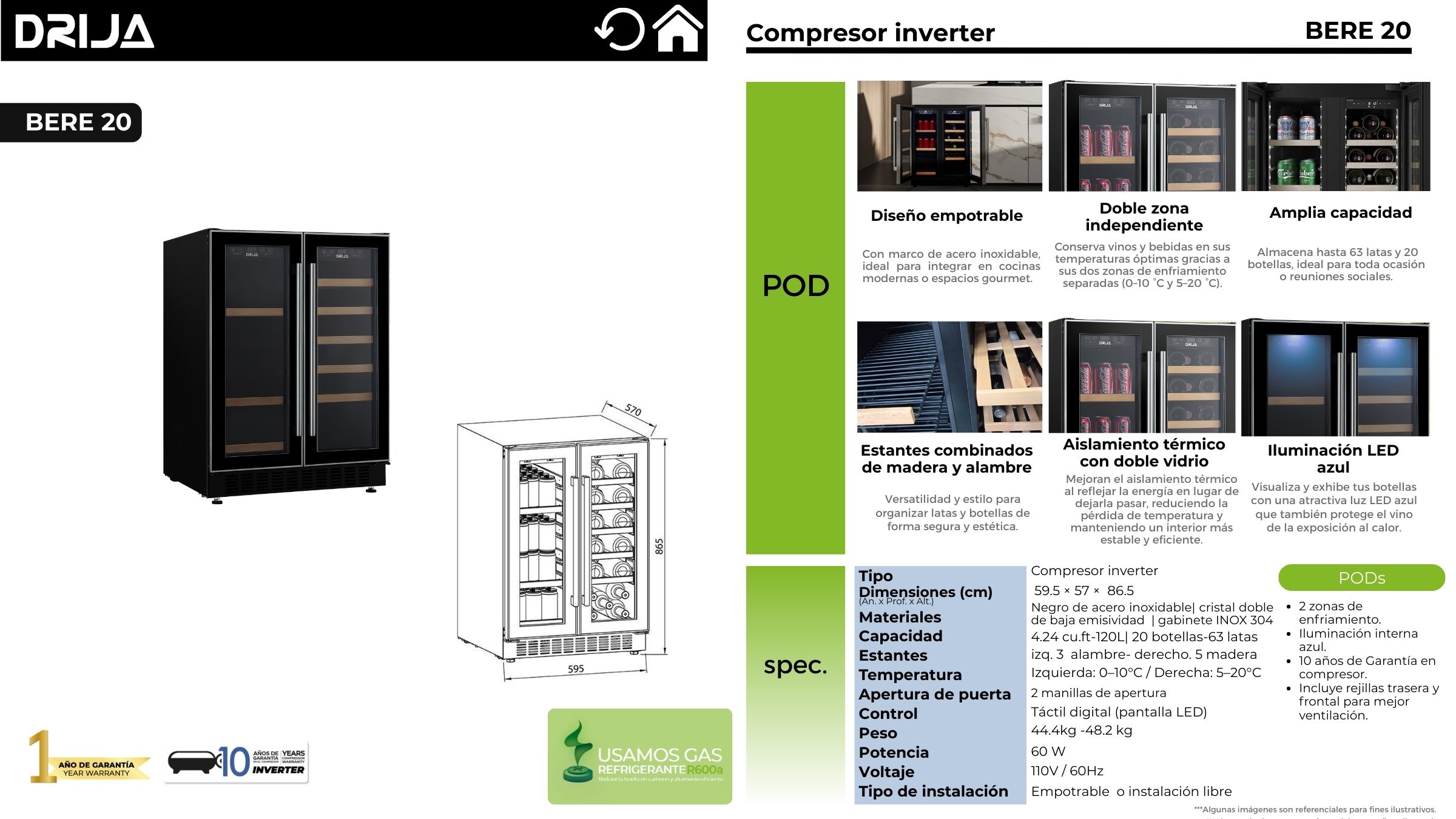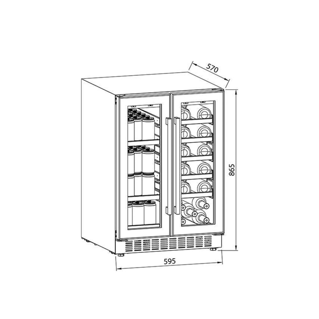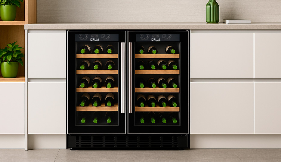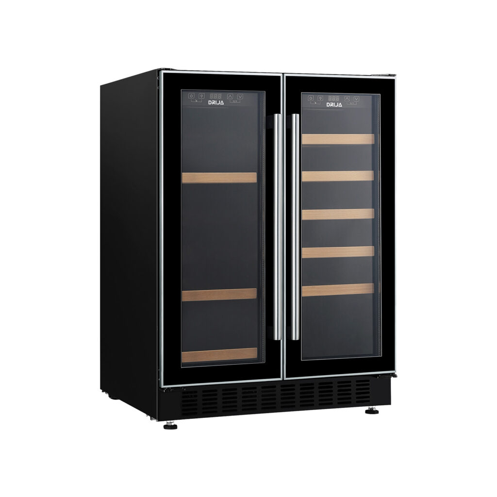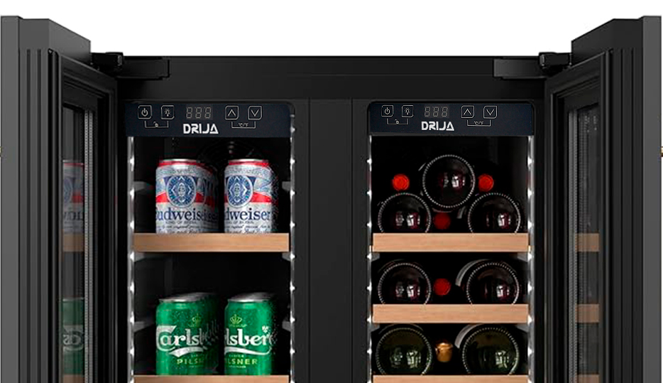 La vinera doble BERE 20 de DRIJA ofrece diseño, tecnología y capacidad superior para quienes buscan conservar y exhibir su colección con estilo. Equipada con compresor inverter de alta eficiencia, cuenta con doble zona de temperatura independiente, iluminación LED azul y estantes combinados de madera y alambre. Su estructura empotrable y elegante puerta de vidrio doble con acero inoxidable la hacen ideal para cocinas modernas, barras gourmet u oficinas.