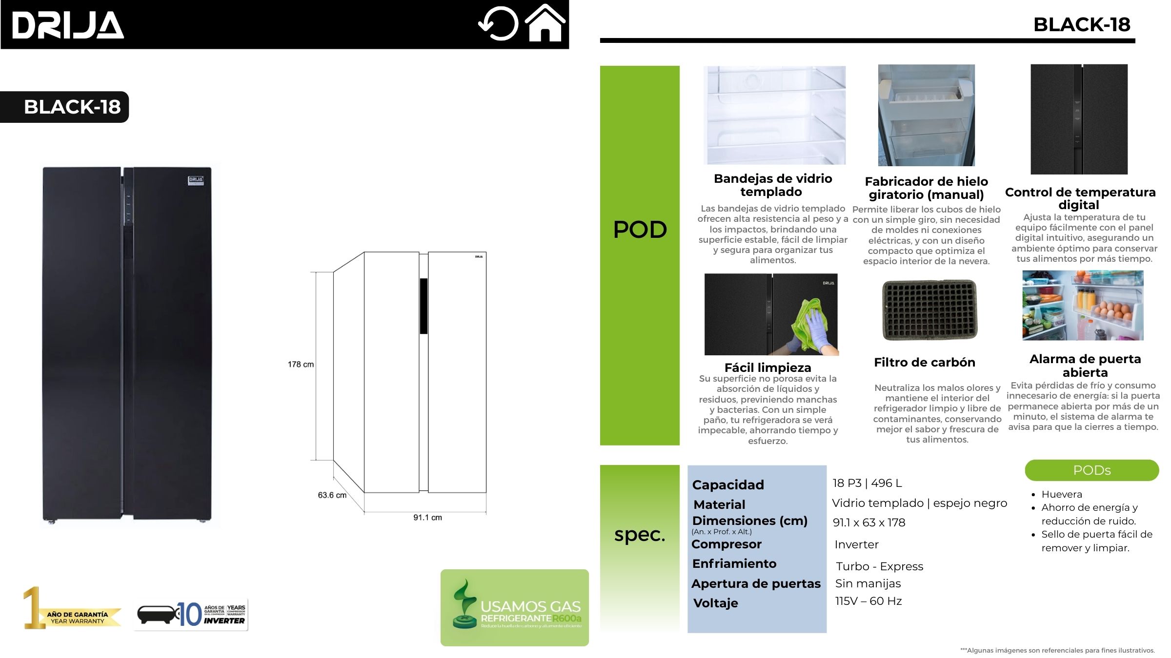 El refrigerador BLACK-18 de DRIJA combina un diseño minimalista en elegante vidrio templado negro con tecnología avanzada para un enfriamiento óptimo. Con su amplio espacio interno y bandejas de vidrio templado, ofrece resistencia, facilidad de limpieza y organización segura de los alimentos. Incluye fabricador de hielo manual, filtro de carbón para mantener la frescura y control de temperatura digital para un manejo preciso. Su superficie no porosa evita la acumulación de bacterias y manchas, mientras que la alarma de puerta abierta previene pérdidas de frío y consumo innecesario de energía.