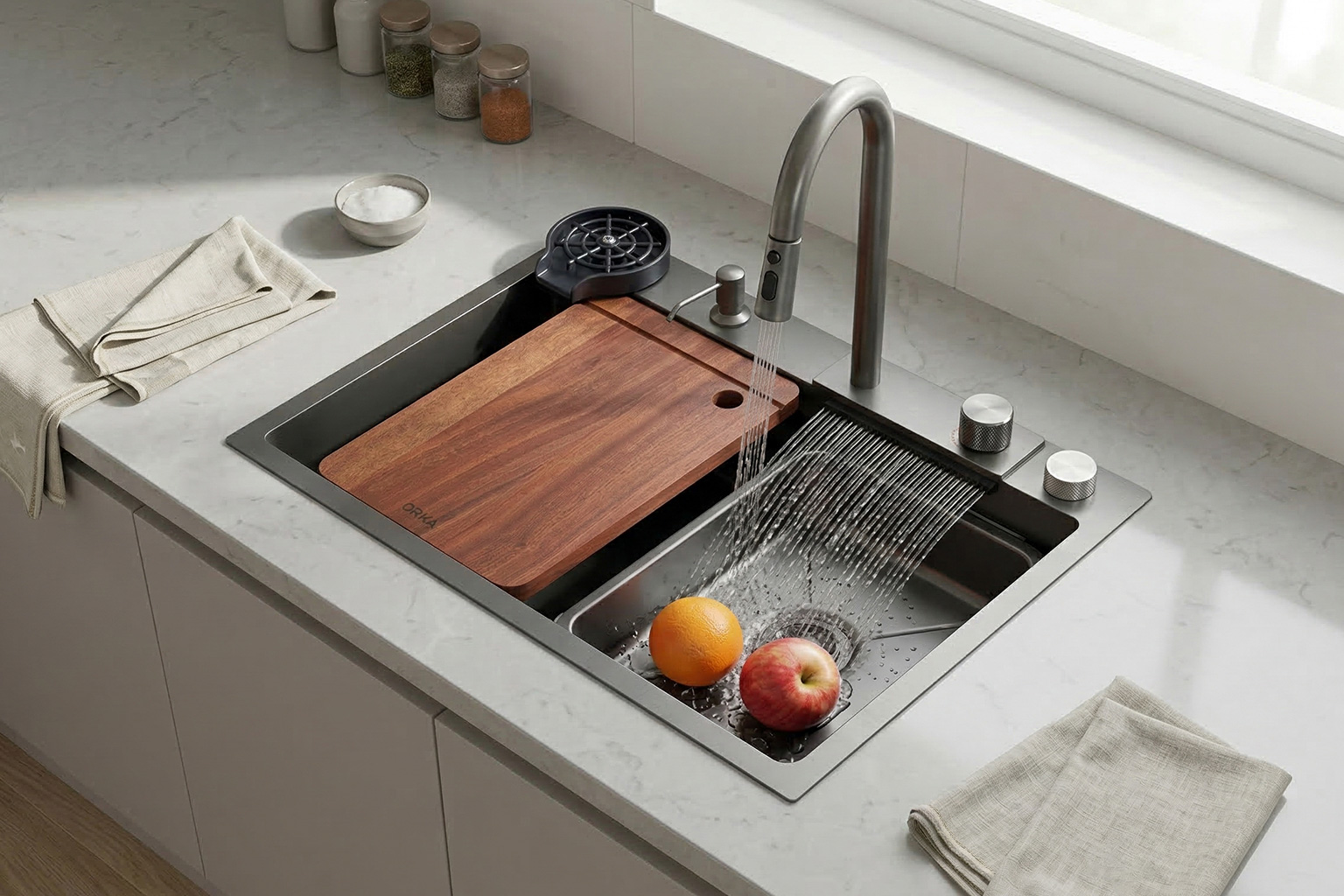 El fregadero CIRELLA 68 está diseñado para cocinas modernas que buscan funcionalidad real sin sacrificar estética. Fabricado en INOX 304 satinado, integra una grifería multifuncional tipo cascada (frío/caliente) con cuello giratorio, cortina de agua para enjuague rápido, enjuagador de vaso a presión y dispensador de jabón de 500 ml para una estación de lavado completa y ordenada. Su sistema anti reboso aporta seguridad en el uso diario, mientras que los accesorios incluidos (tabla y escurridor) te permiten separar tareas y trabajar con más higiene y practicidad.