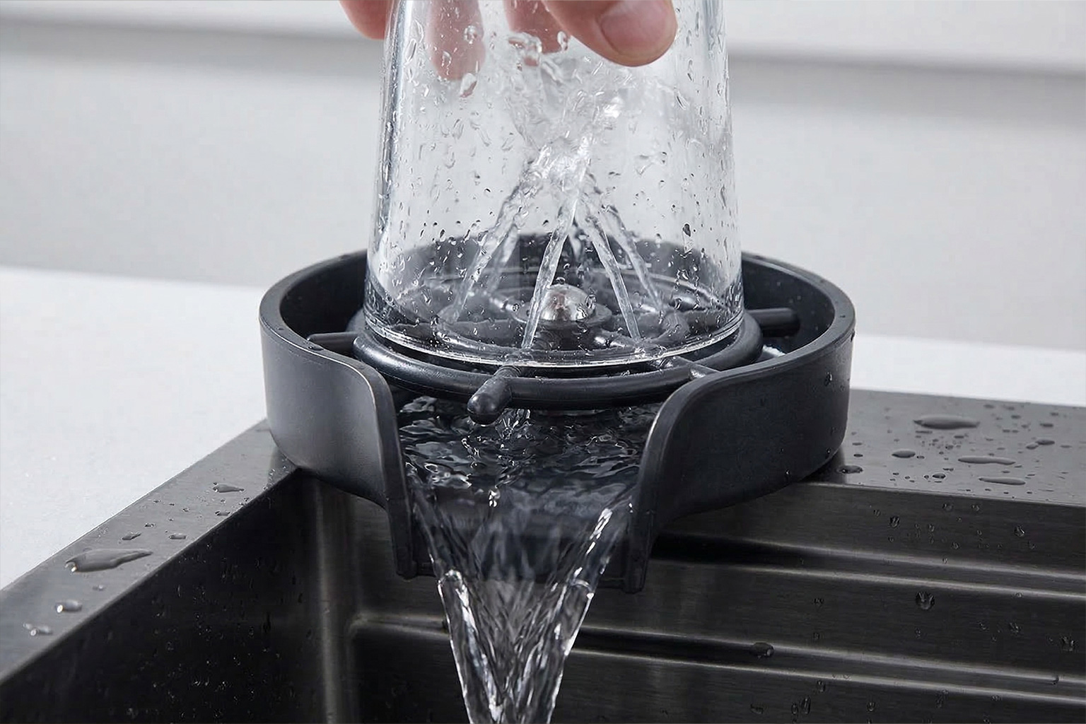 Enjuagador de vasos a presión que elimina residuos al instante; ideal para copas, tazas y botellas, con limpieza rápida y sin esfuerzo.