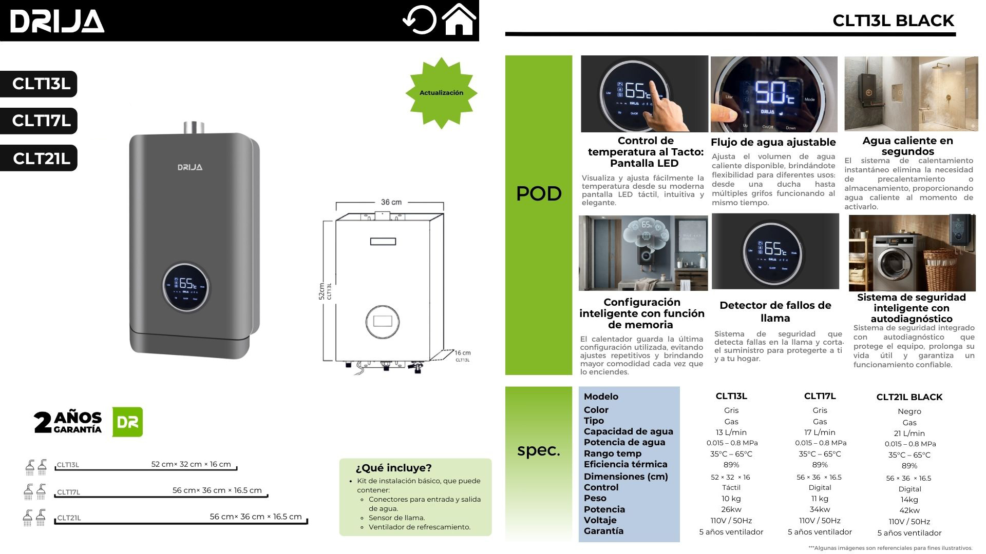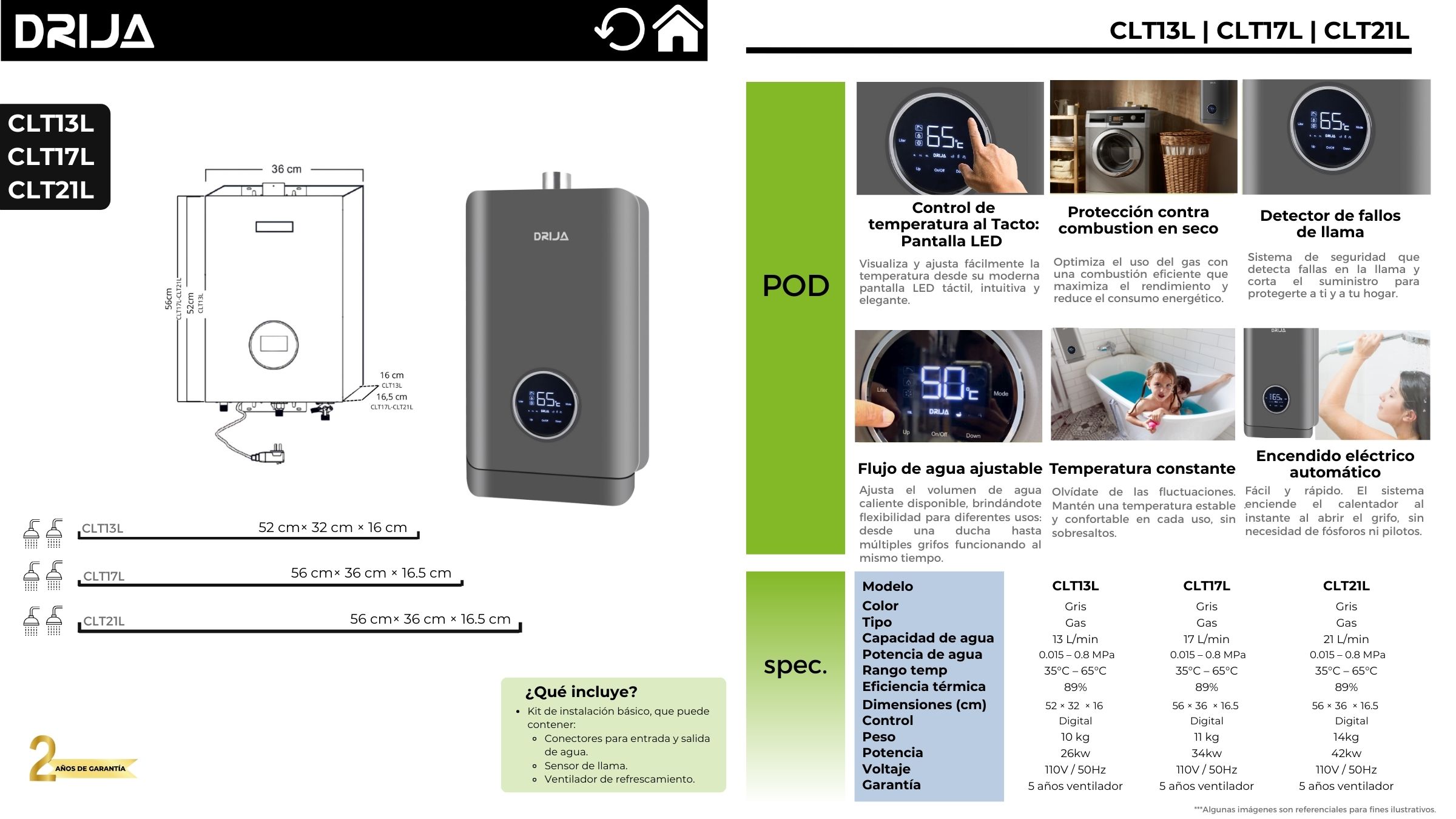 Los calentadores de agua a gas DRIJA modelos CLT13L, CLT17L y CLT21L ofrecen un diseño moderno y funcional con pantalla LED táctil para control de temperatura. Incorporan encendido eléctrico automático, detector de fallos de llama y temperatura constante para un uso seguro y cómodo. Su sistema de flujo de agua ajustable permite atender múltiples puntos de consumo, garantizando agua caliente inmediata con máxima eficiencia y ahorro energético.