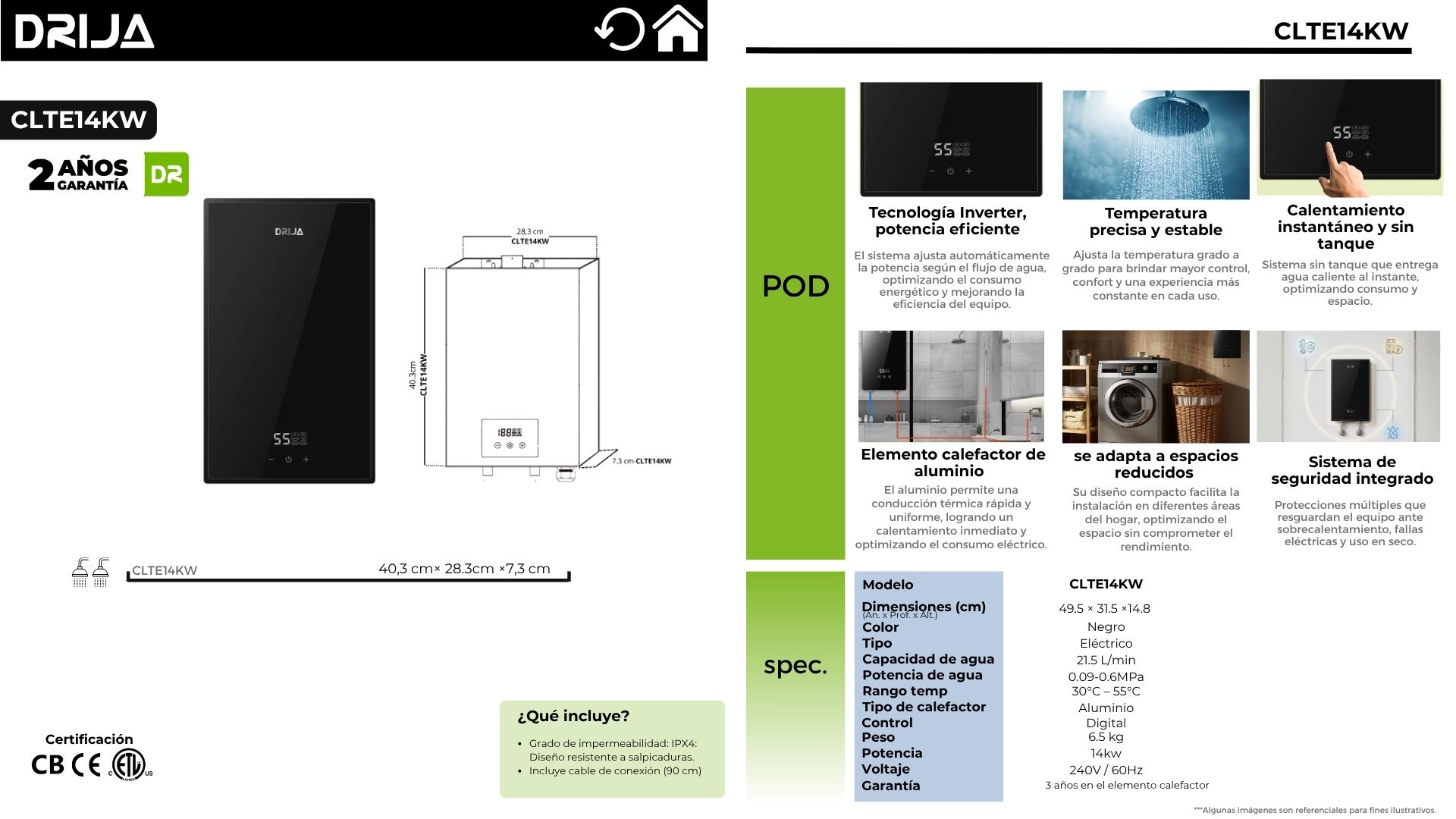 El CLTE14KW de DRIJA es un calentador de agua eléctrico de alto rendimiento con tecnología Inverter, que ajusta automáticamente la potencia según el flujo de agua para optimizar el consumo eléctrico. Su diseño compacto con panel táctil aporta un toque moderno y elegante a cualquier baño. Ofrece calentamiento instantáneo sin tanque, resistencia interna de aluminio para mayor durabilidad y encendido eléctrico automático para un uso seguro y práctico.