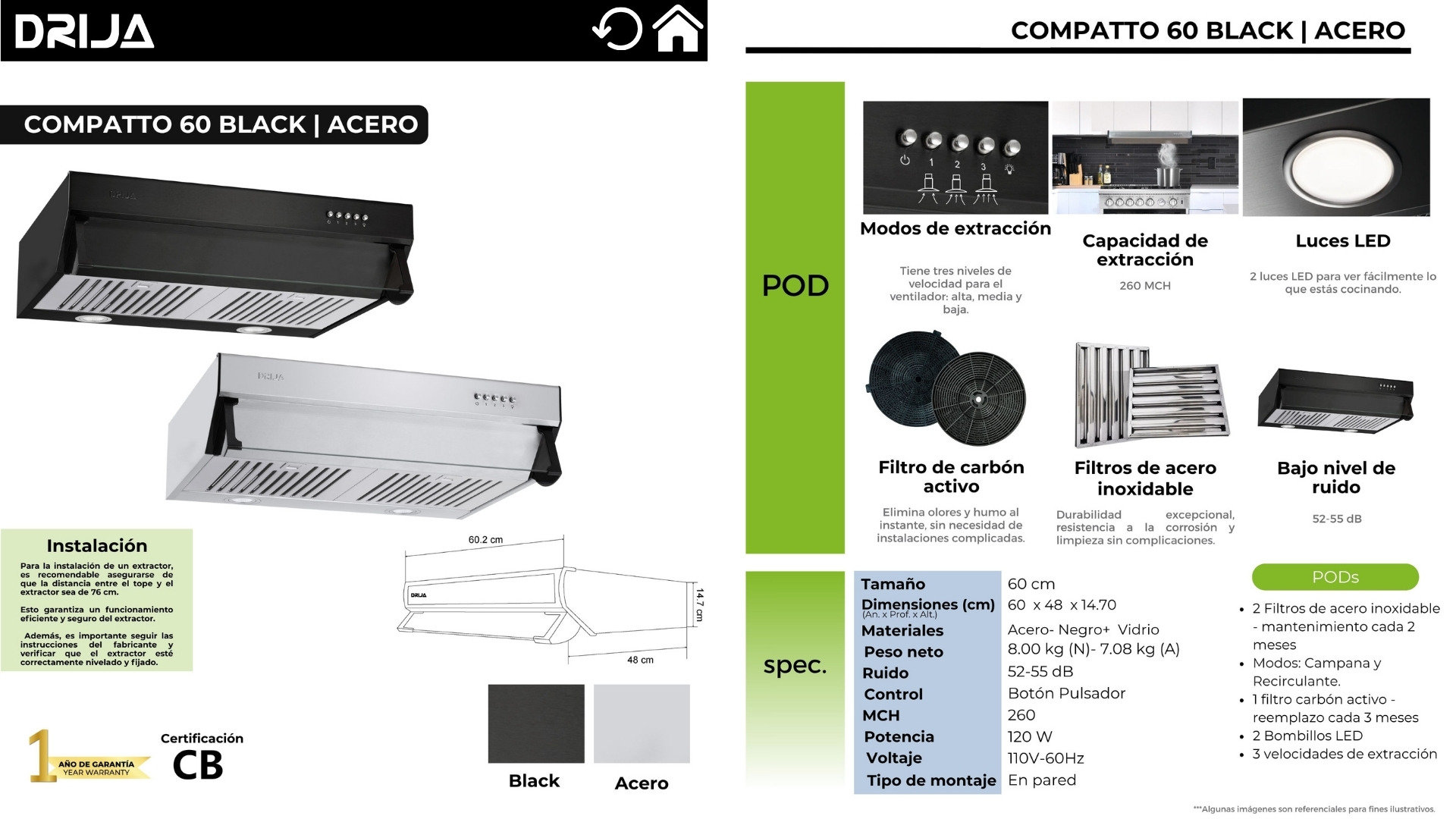 Campana extractora de montaje en pared, con diseño compacto de 60 cm, cuerpo de acero con frente en vidrio. Ofrece alta capacidad de extracción, bajo nivel de ruido y sistema de filtrado doble (carbón activo + acero inoxidable).