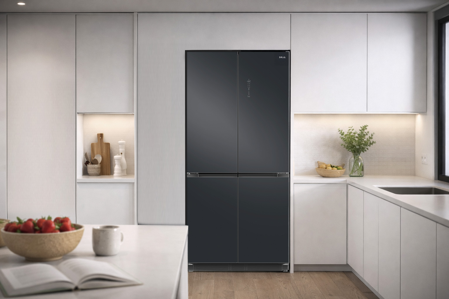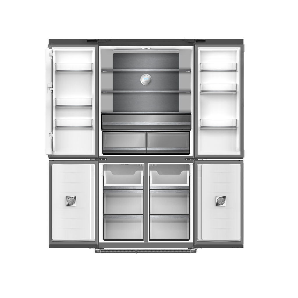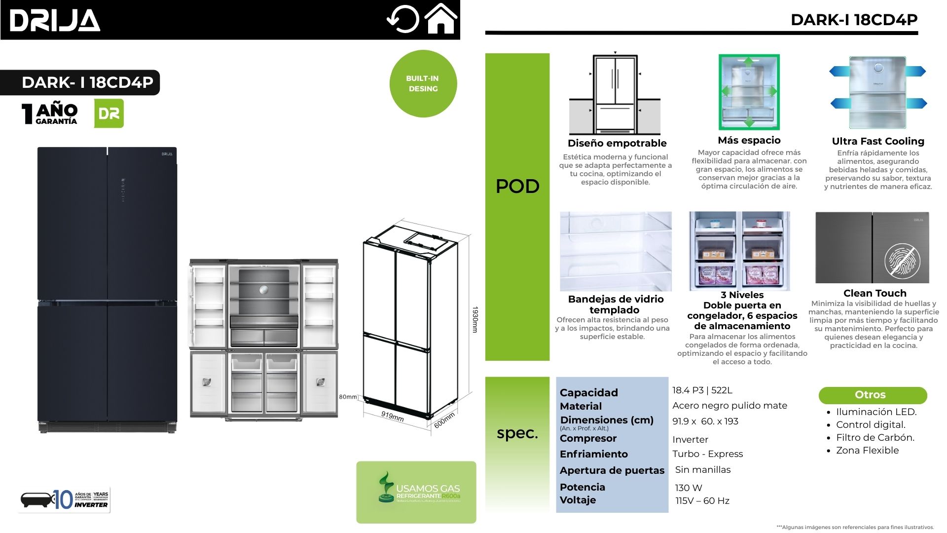 El DARK- I 18CD4P es un refrigerador empotrable de gran capacidad, diseñado para integrarse con una estética moderna y funcional en cocinas contemporáneas. Su acabado en acero negro pulido mate aporta presencia premium y, gracias a la tecnología Clean Touch, ayuda a minimizar la visibilidad de huellas para mantener el frente más limpio por más tiempo.