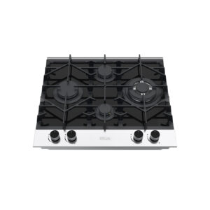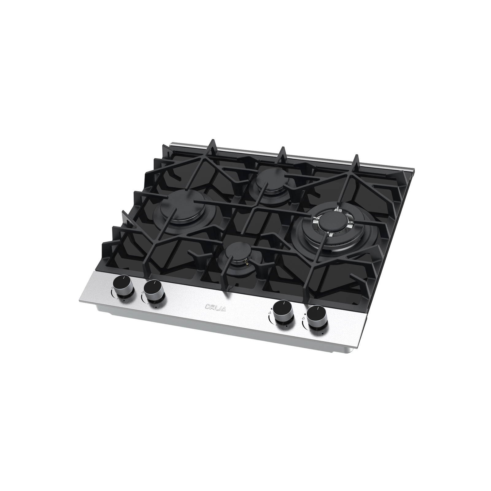 Estufa de empotrar de 60 cm con elegante superficie combinada de acero inoxidable cepillado y vidrio templado negro de 8 mm. Equipada con cinco quemadores de aluminio SABAF y parrillas de hierro colado, ofrece durabilidad, diseño moderno y una cocción precisa en todo momento.