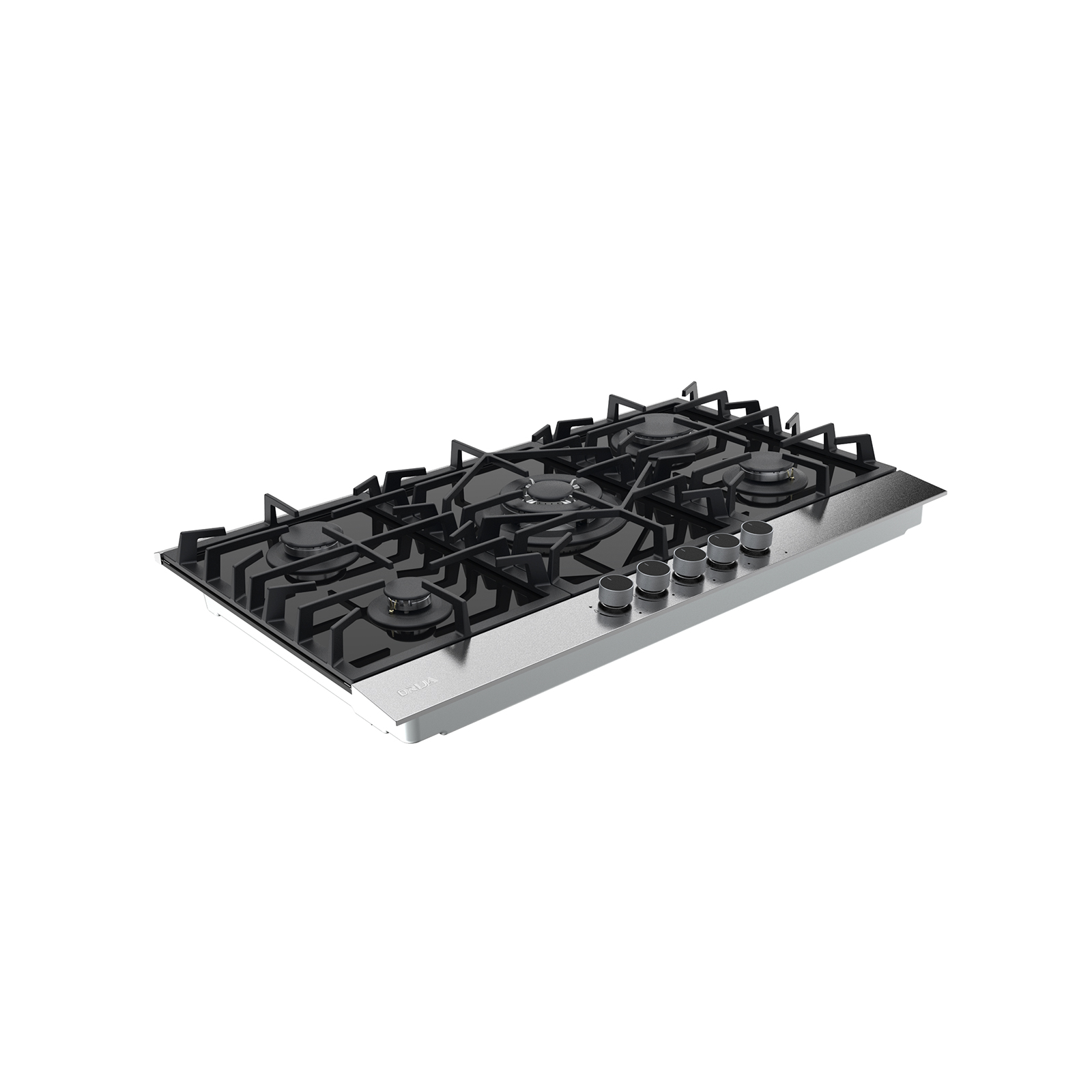 Elegante superficie en acero inoxidable cepillado que facilita la limpieza, acompañada de parrillas de hierro colado negro mate que dan un acabado profesional.