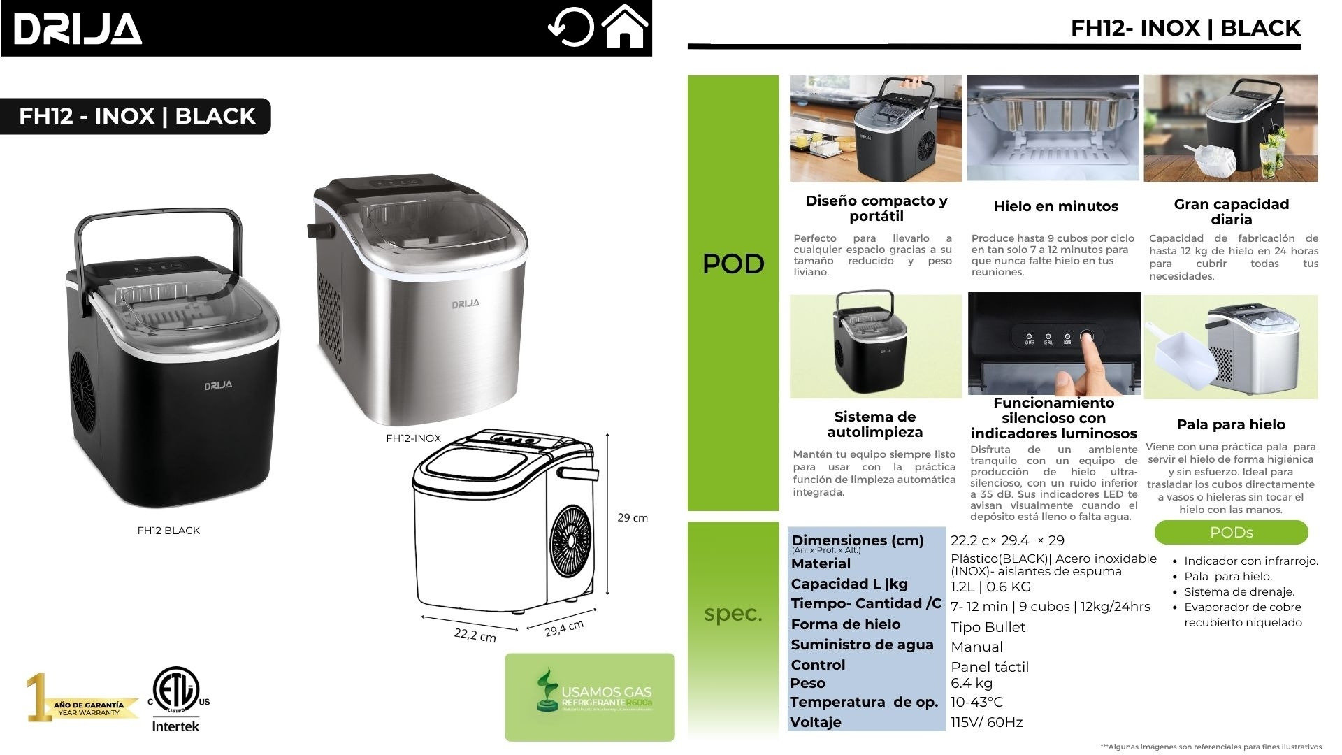 La FH12-INOX | BLACK de DRIJA es una máquina de hielo portátil, ideal para uso doméstico o en exteriores. Con capacidad de producción de 12 kg en 24 horas y depósito de 1.2 L, permite obtener 9 cubos de hielo en tan solo 7 a 12 minutos. Su diseño compacto y liviano, junto con la función de autolimpieza y panel táctil con indicadores luminosos, la convierten en una solución práctica y eficiente para tener hielo fresco en cualquier momento y lugar.