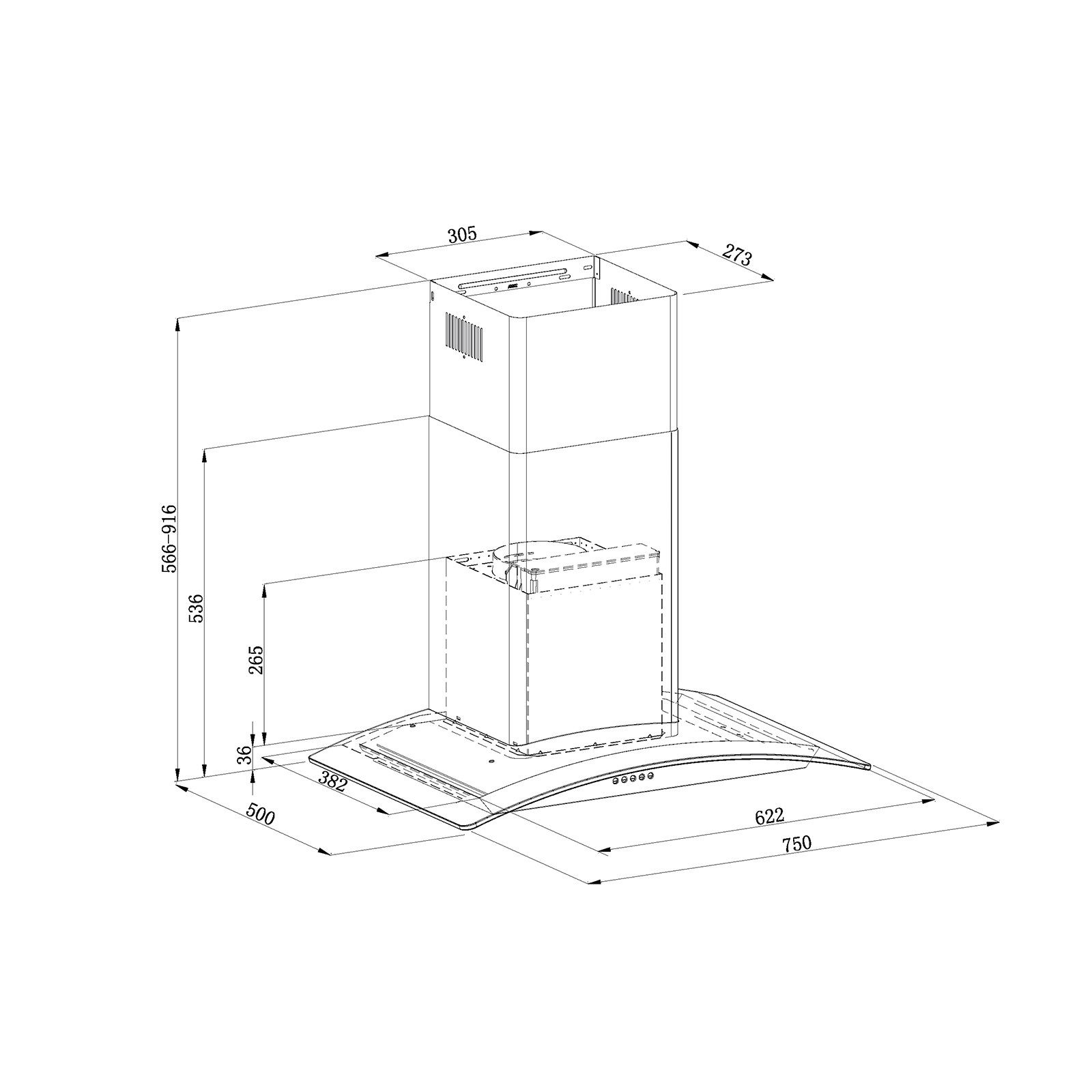 Campana decorativa de 76 cm en acero y vidrio templado curvo. Cuenta con panel de botones, doble sistema de filtrado, luces LED y diseño con chimenea ajustable. Ideal para cocinas modernas con estilo y funcionalidad.
