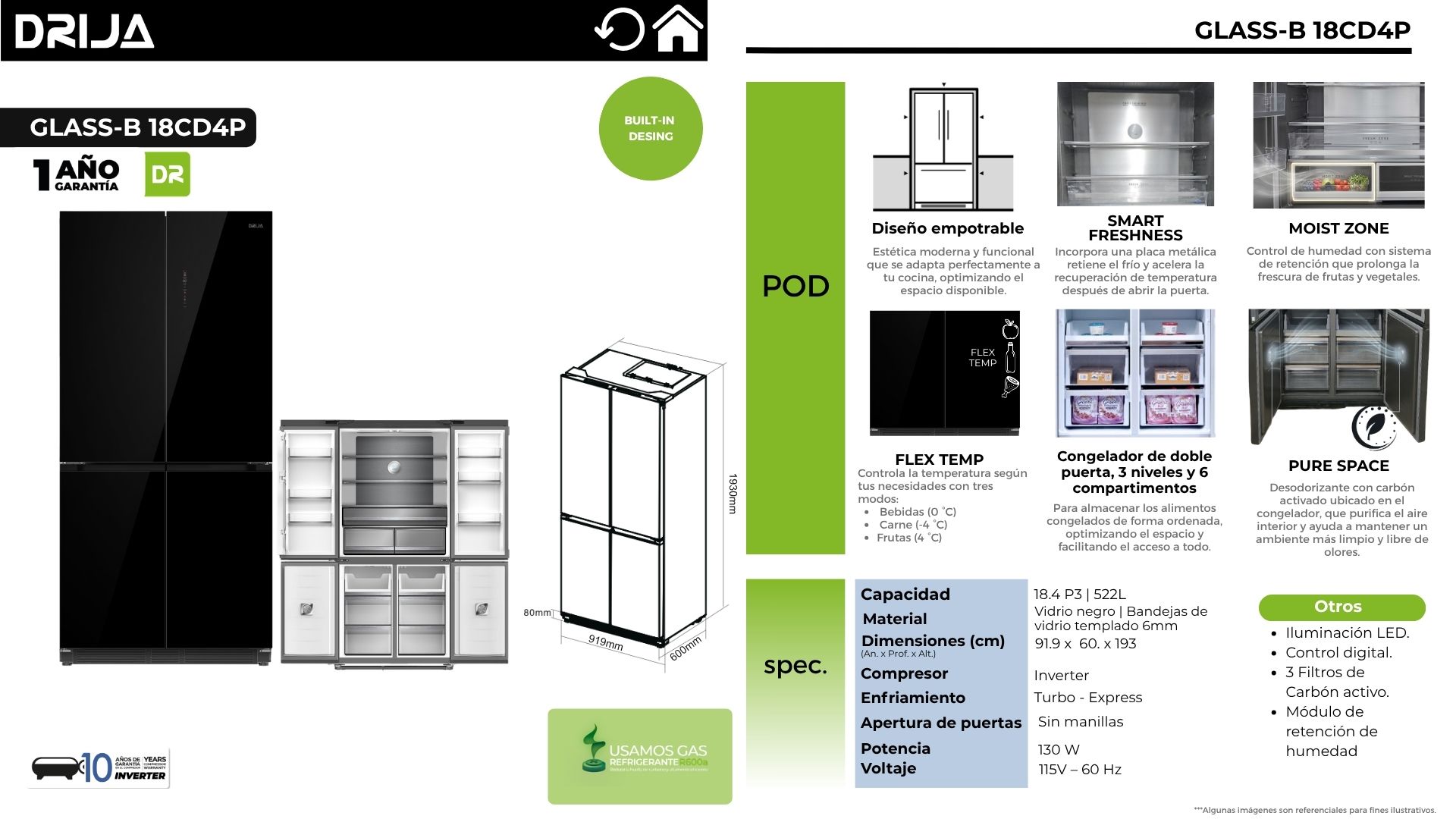 El refrigerador GLASS-B 18CD4P combina un diseño empotrable con acabado en vidrio negro para integrarse limpio y elegante en cocinas modernas. Su sistema Turbo – Express con compresor Inverter mejora la estabilidad de temperatura y acelera el enfriamiento, mientras el interior ofrece bandejas de vidrio templado resistentes y un congelador organizado en 3 niveles, con doble puerta y 6 espacios de almacenamiento para mantener todo en orden. Además, su superficie facilita la limpieza diaria y ayuda a conservar una apariencia impecable por más tiempo.