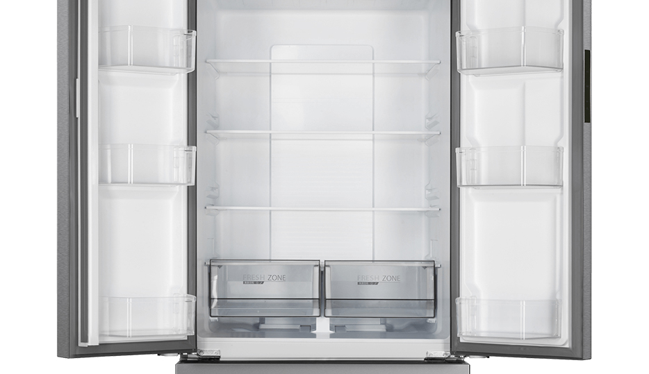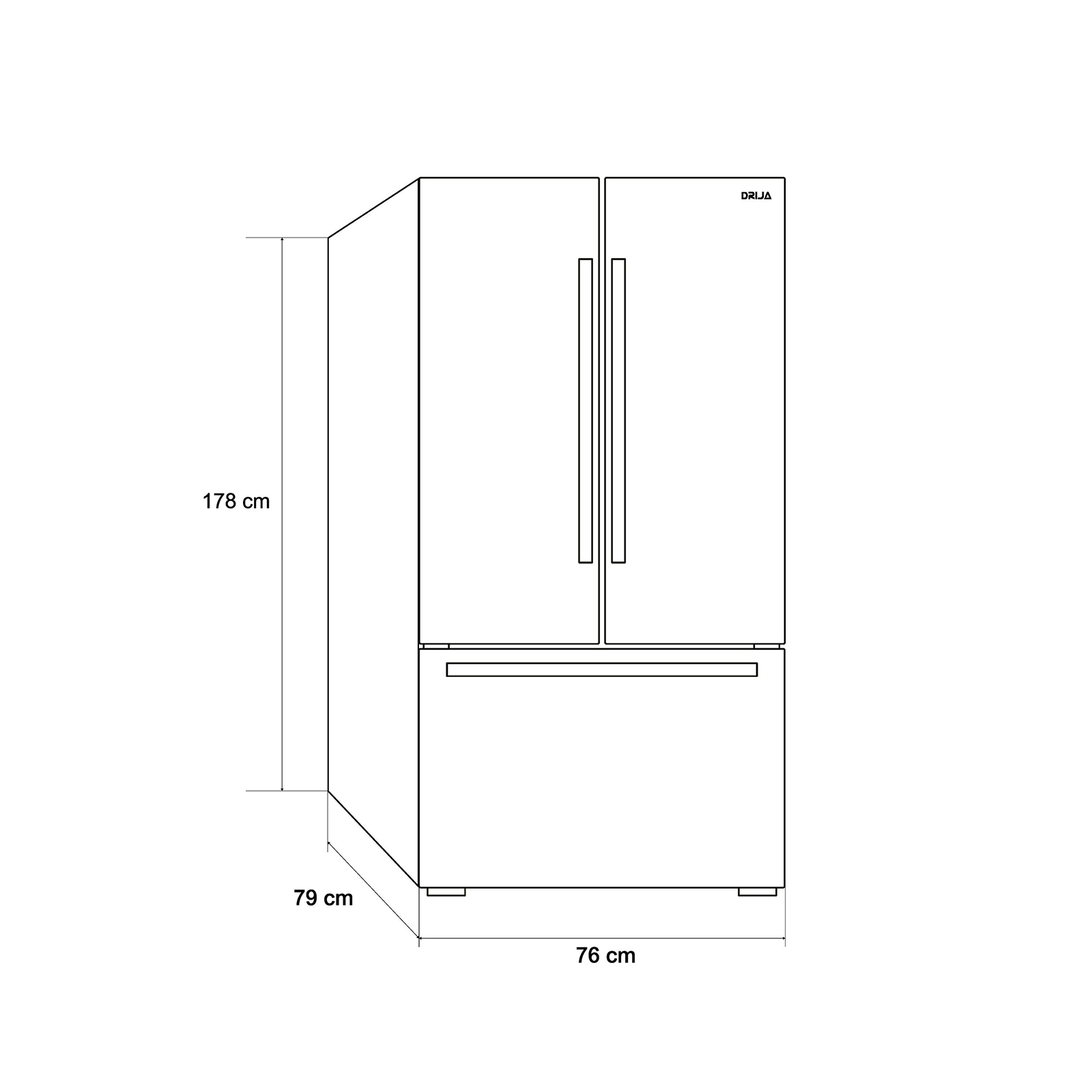 El refrigerador INOX-18D3P de DRIJA combina un diseño moderno en acero inoxidable con puertas tipo French Door y capacidad de 18 P³ / 509 L. Ofrece multi zona de enfriamiento y Ultra Fast Cooling para mantener los alimentos frescos por más tiempo. Incluye bandejas de vidrio templado, bandeja de congelador ajustable, iluminación LED y filtro de carbón para preservar la frescura. Su superficie es fácil de limpiar y su apertura con manijas ofrece un agarre ergonómico.