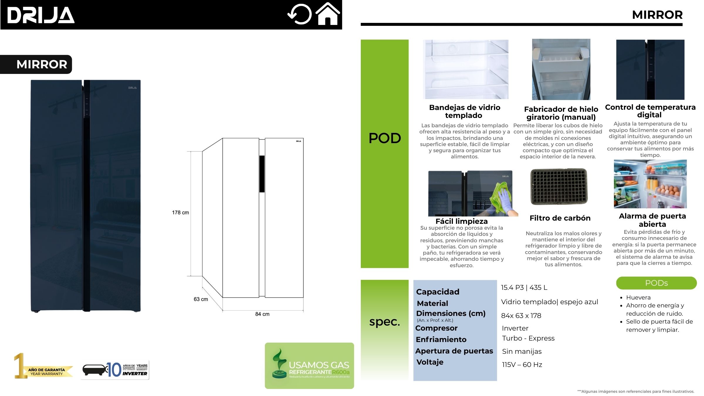 El refrigerador MIRROR de DRIJA combina un acabado espejo moderno y elegante con una capacidad de 15.4 P³ / 435 L, ideal para quienes buscan estilo y funcionalidad en su cocina. Sus bandejas de vidrio templado brindan resistencia y seguridad para organizar alimentos, mientras que el control de temperatura digital permite ajustar el enfriamiento de manera precisa. Incluye fabricador de hielo giratorio (manual), filtro de carbón para mantener la frescura y alarma de puerta abierta para optimizar el consumo energético. Su superficie no porosa facilita la limpieza y evita la acumulación de bacterias.