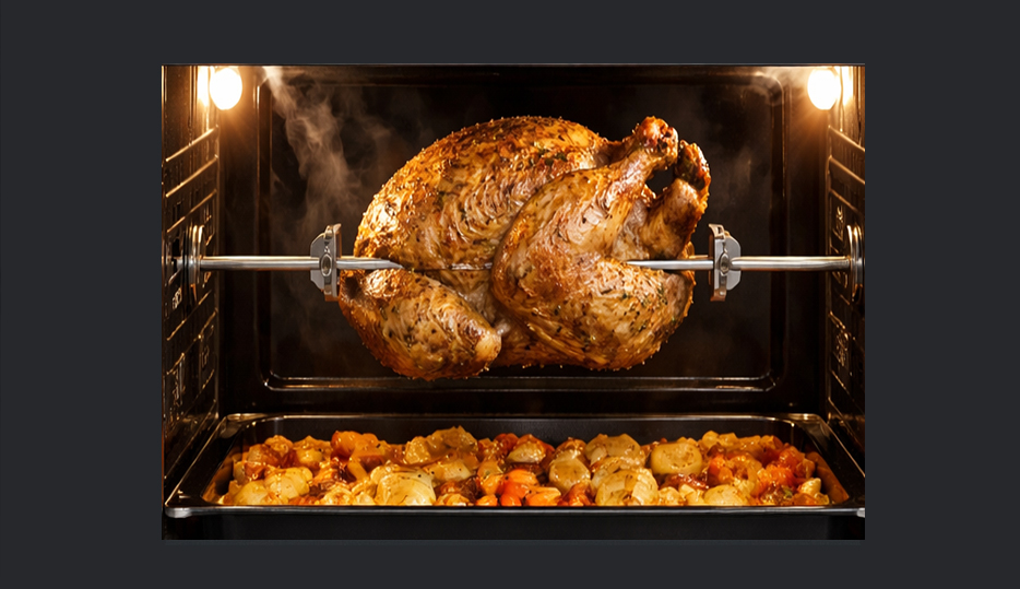 Accesorio rotatorio interno que transforma el horno en un asador tipo rotisserie, girando automáticamente para lograr cocción pareja y dorado homogéneo.
