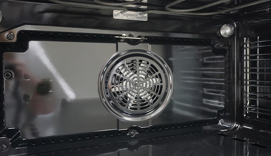 Sistema de convección con ventilador trasero que distribuye el calor de manera uniforme, logrando una cocción pareja y potenciando el dorado y lo crujiente.