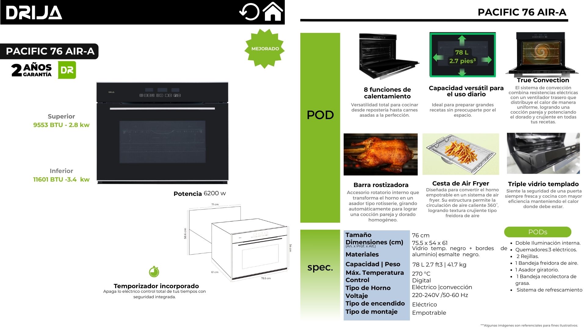 El PACIFIC 76 AIR-A es un horno empotrable de 76 cm con control digital y True Convection para una cocción más uniforme y resultados más consistentes. Su capacidad de 78 L (2.7 ft³) te da espacio real para cocinar en grande, mientras que sus accesorios —como barra rostizadora (rotisserie) y cesta tipo air fryer— amplían las posibilidades de recetas crujientes, doradas y bien hechas. Ideal para cocinas modernas que buscan versatilidad, potencia y practicidad en el día a día. Instálalo empotrado y eleva tu cocina con convección real y accesorios completos.