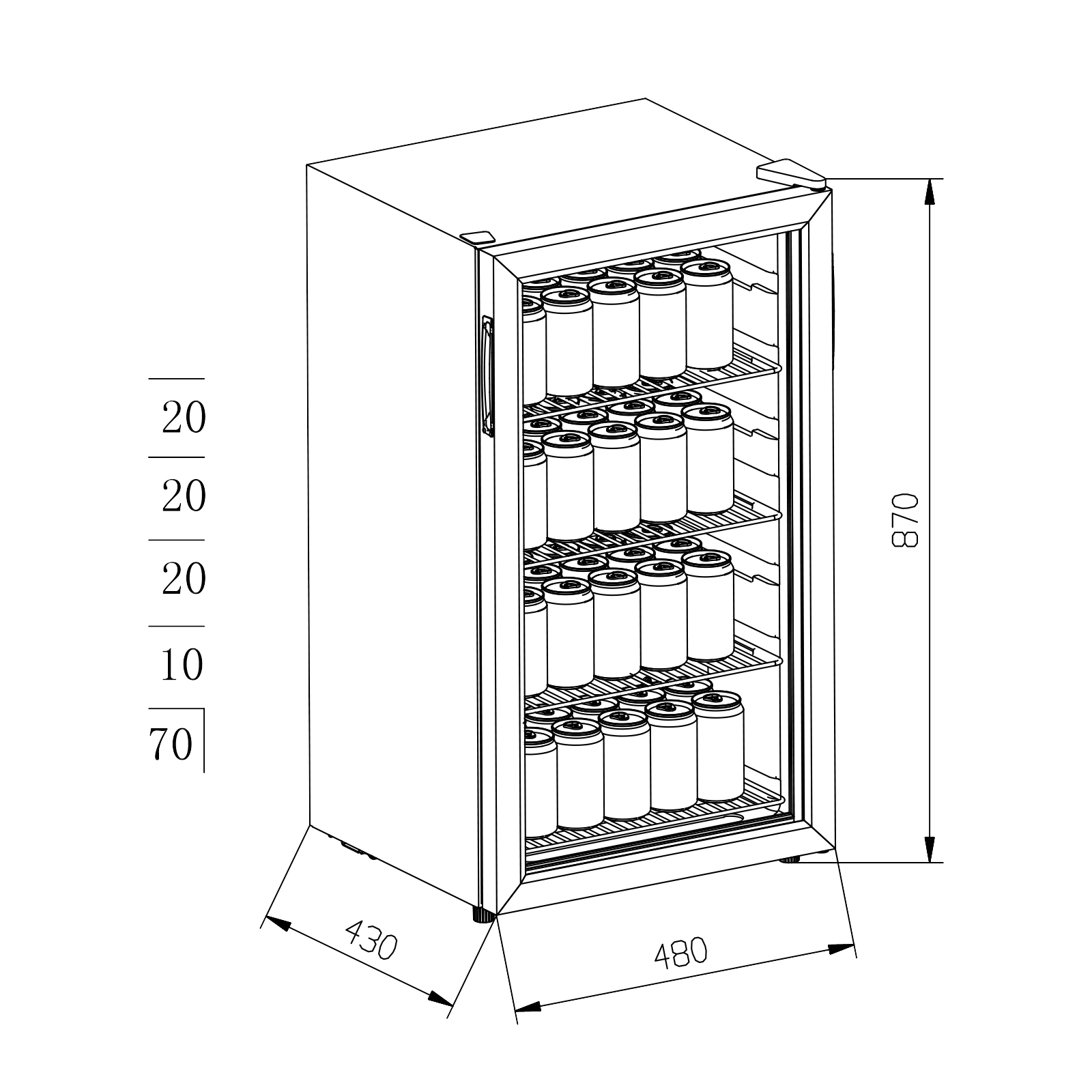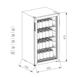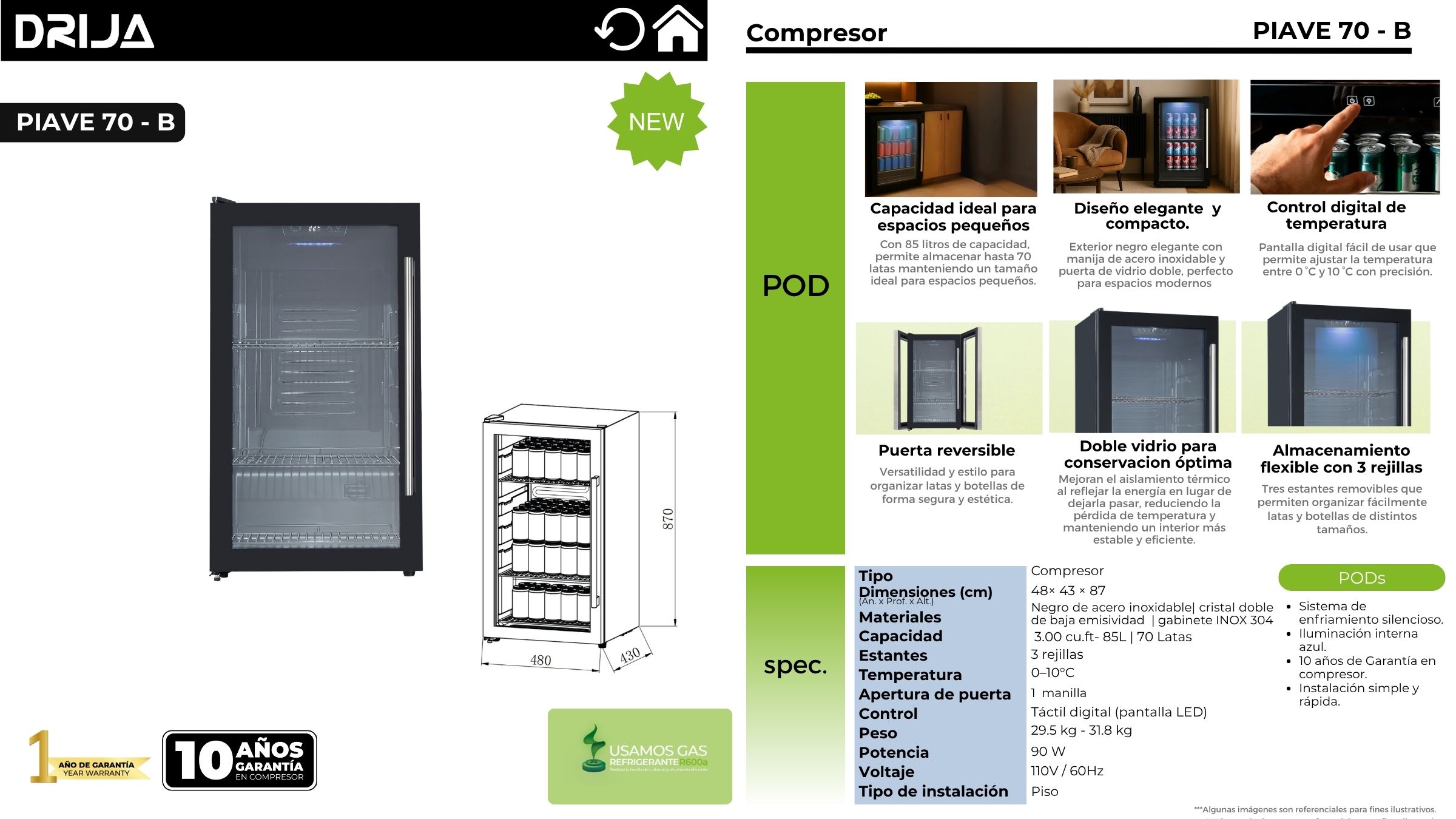 Con 85 litros de capacidad, permite almacenar hasta 70 latas, manteniendo una temperatura estable entre 0 °C y 10 °C gracias a su sistema de enfriamiento por compresor.