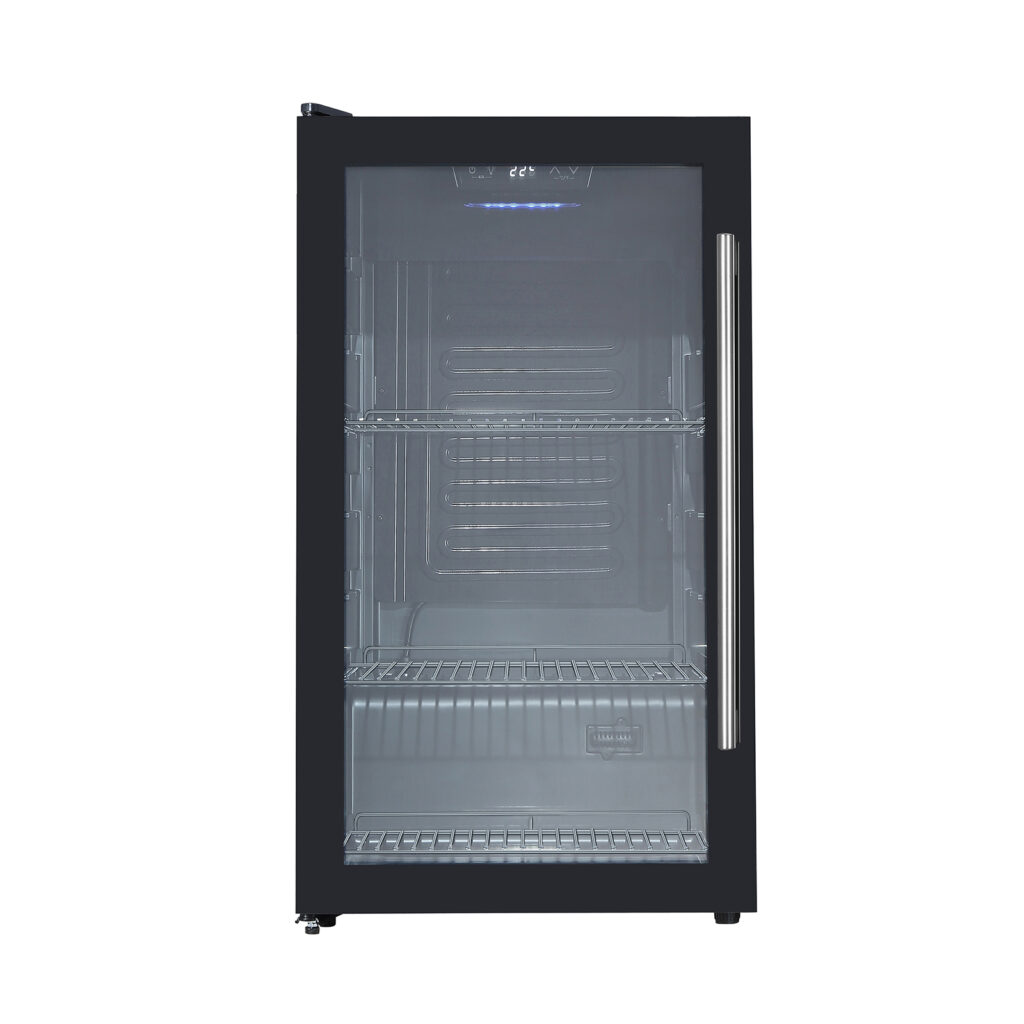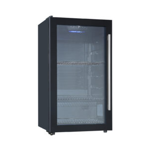 Su puerta reversible de doble vidrio con marco negro elegante y manija de acero inoxidable garantiza una óptima conservación del frío y una presentación moderna.