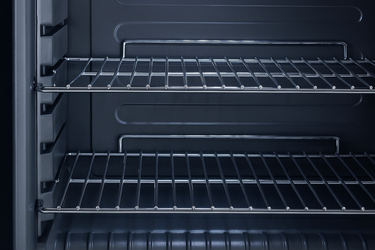 Tres rejillas metálicas removibles que se adaptan a diferentes tamaños de botellas y latas.