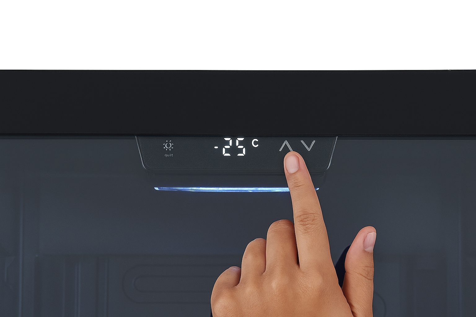Pantalla táctil LED que permite regular con precisión la temperatura entre 0 °C y 10 °C.