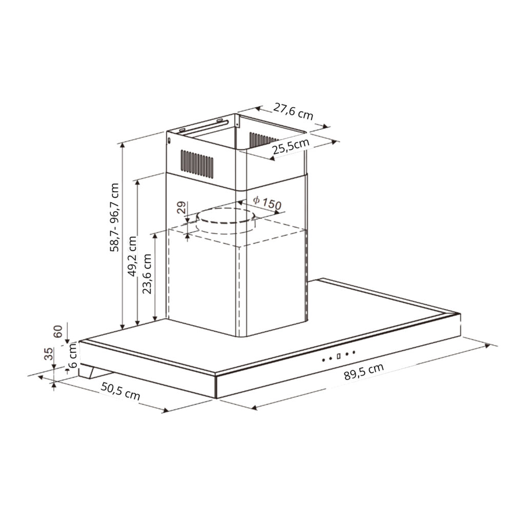 El extractor PIRÁMIDE 90 BLACK combina una estética sobria con desempeño real para cocinas que necesitan control de humo, vapor y olores sin recargar el espacio. Su diseño vertical y compacto se integra con facilidad en cocinas modernas, aportando un acabado elegante en negro con vidrio frontal negro.