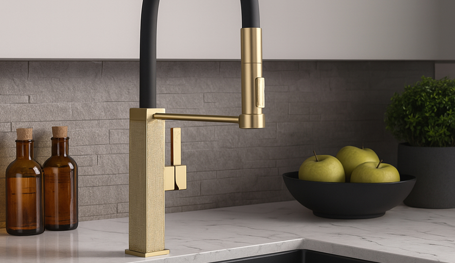 La grifería PISA BLACK | GOLD de DRIJA redefine la elegancia en la cocina con un diseño premium, cuerpo metálico texturizado y acabados exclusivos en dorado cepillado o negro mate. Su cuello flexible de 60 cm y su rociador de doble función garantizan practicidad total. El monomando lateral ergonómico brinda control preciso, mientras que la textura antideslizante realza la experiencia de uso y estilo.