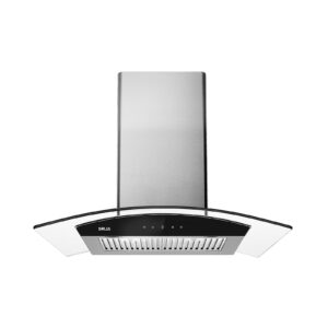 Campana decorativa de 90 cm con diseño curvo en acero y vidrio templado. Equipada con panel digital, triple filtración y alta eficiencia de extracción, ideal para cocinas modernas y funcionales.
