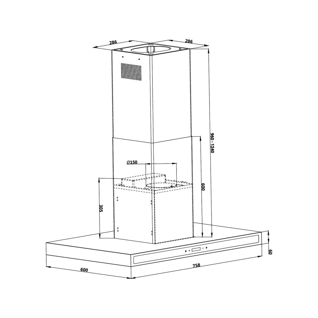 Campana tipo isla de 76 cm con diseño moderno y compacto. Cuenta con doble panel digital, gran capacidad de extracción, 4 luces LED, doble chimenea ajustable y sistema de filtrado completo para alto rendimiento.