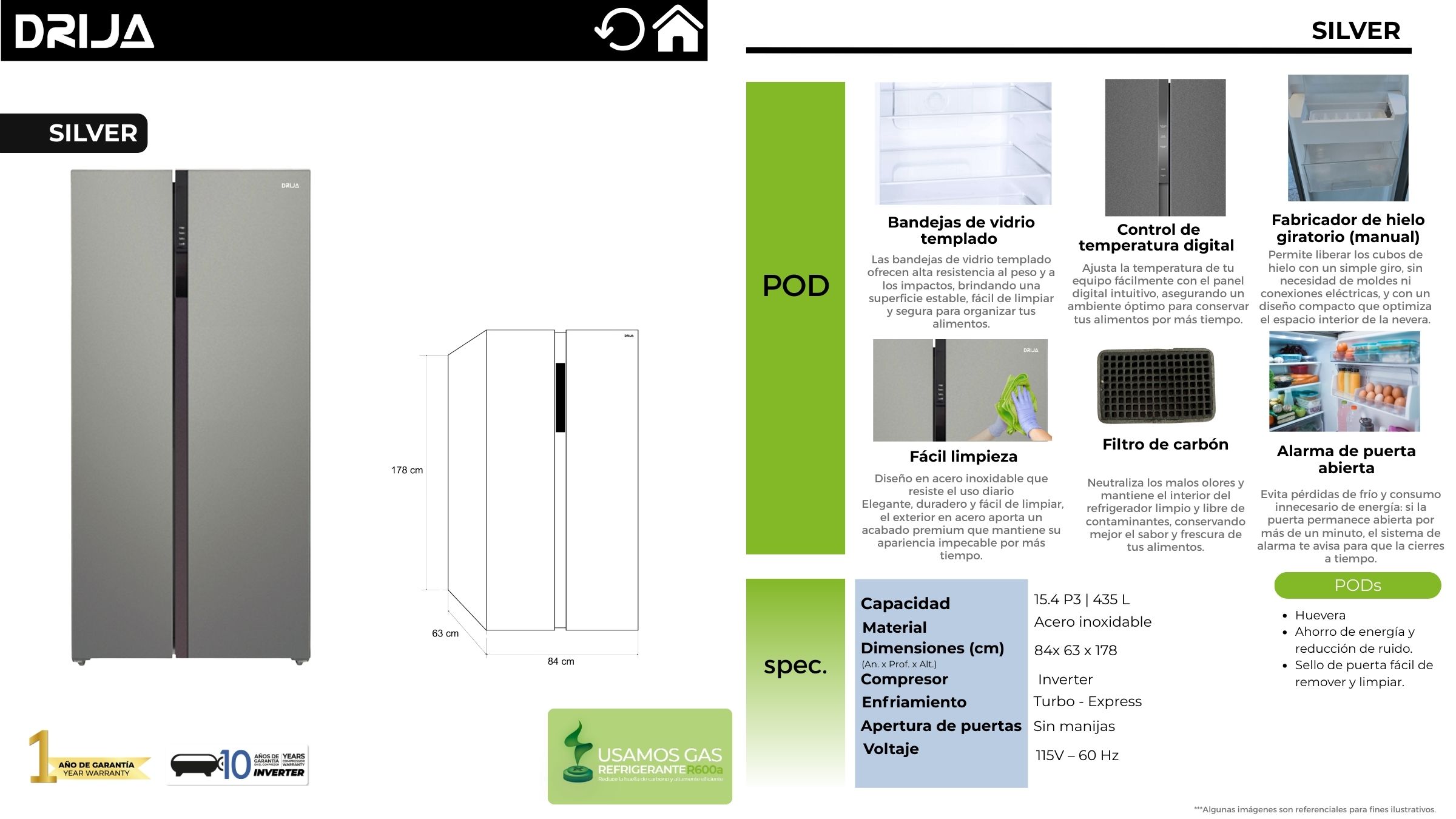 La nevera SILVER de DRIJA fusiona elegancia, resistencia y practicidad en un diseño side-by-side moderno y funcional. Su acabado en acero inoxidable y apertura sin manijas se integran con estilo en cualquier cocina. Incorpora control digital de temperatura, filtro de carbón y sistema de alarma de puerta abierta, pensados para maximizar la frescura y eficiencia energética.