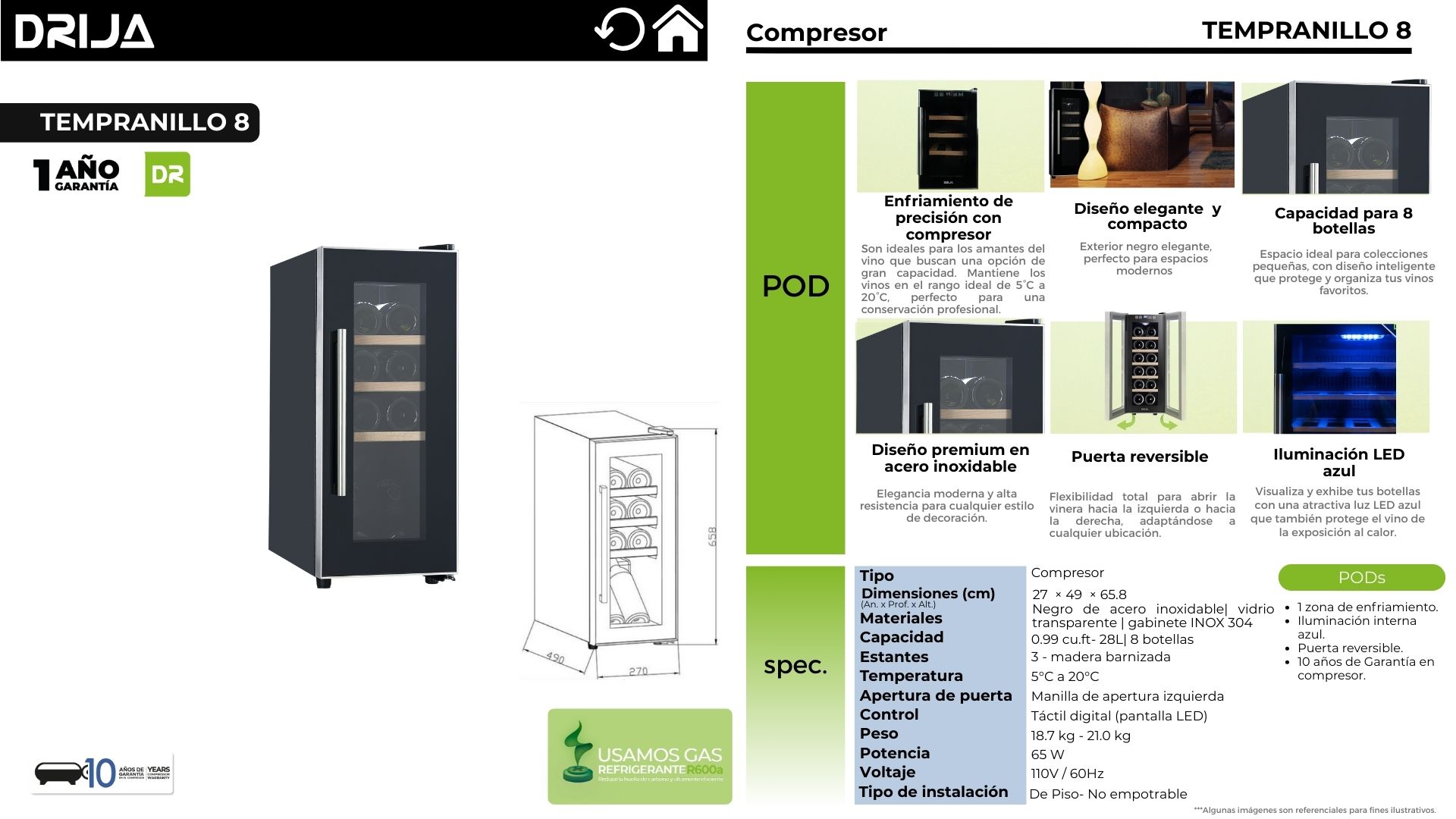 La vinera Tempranillo 8 de DRIJA ofrece conservación profesional para tu colección de vinos gracias a su sistema de enfriamiento por compresor, ideal para mantener la temperatura entre 5 °C y 20 °C con precisión. Su diseño compacto en acero inoxidable, puerta reversible y capacidad para 8 botellas la convierten en una opción perfecta para hogares, oficinas o espacios gourmet. Además, cuenta con iluminación LED azul, estantes de madera y garantía extendida de 10 años en el compresor.