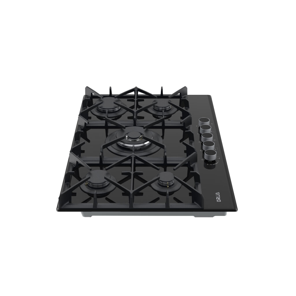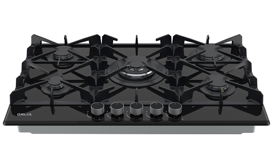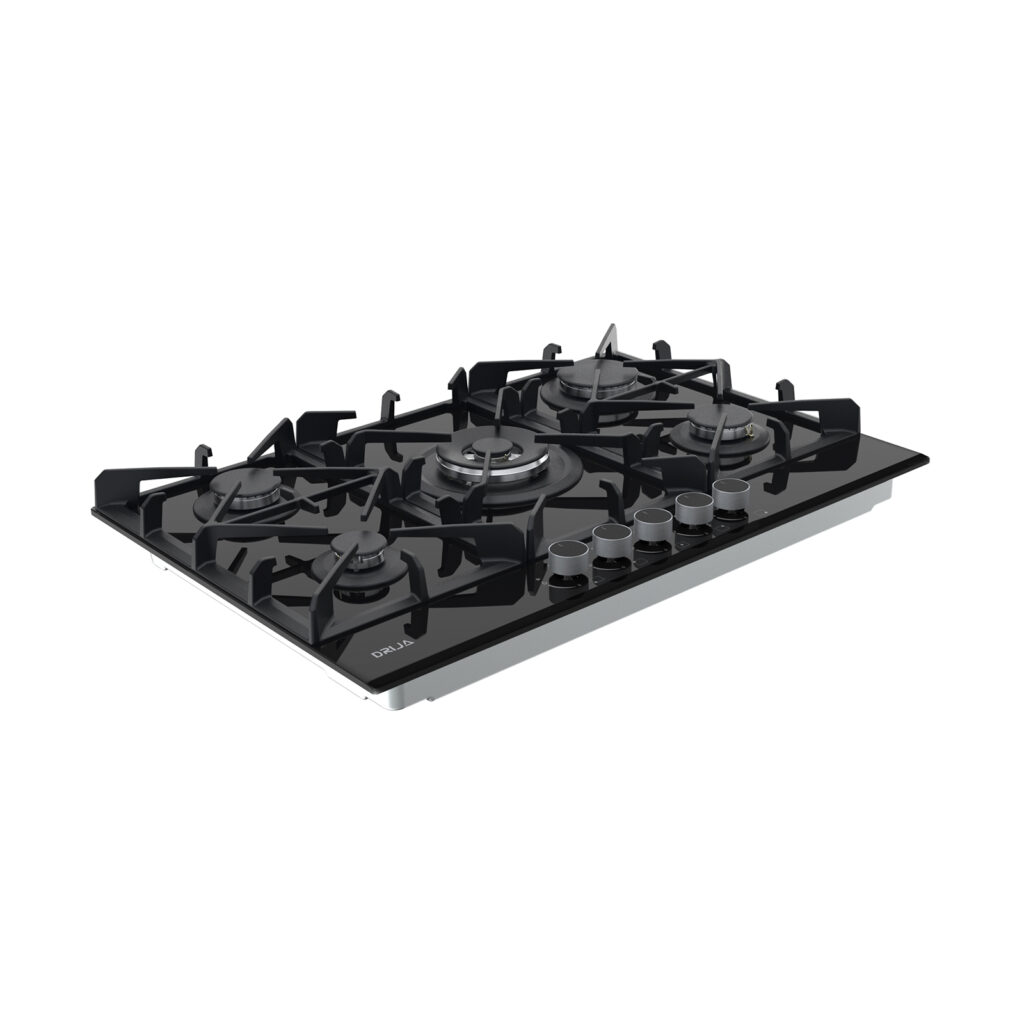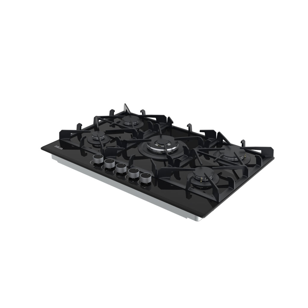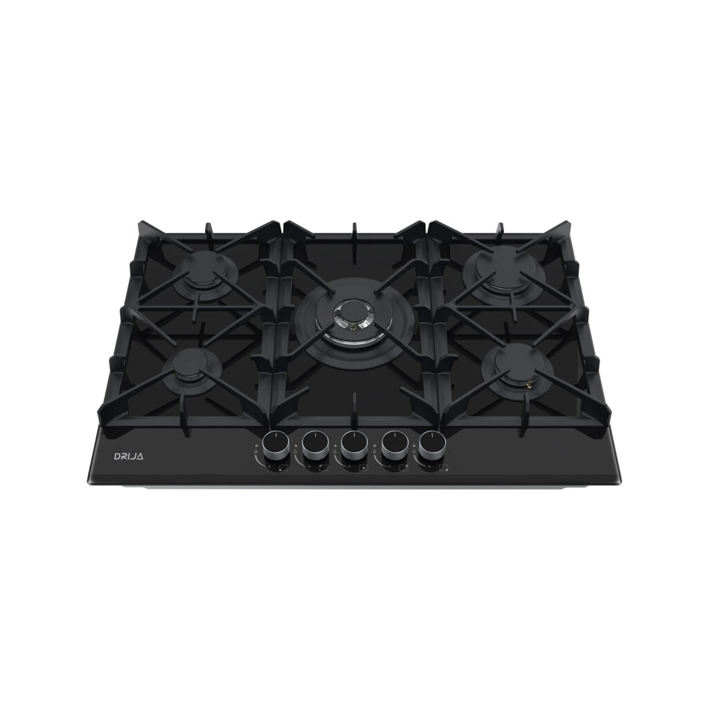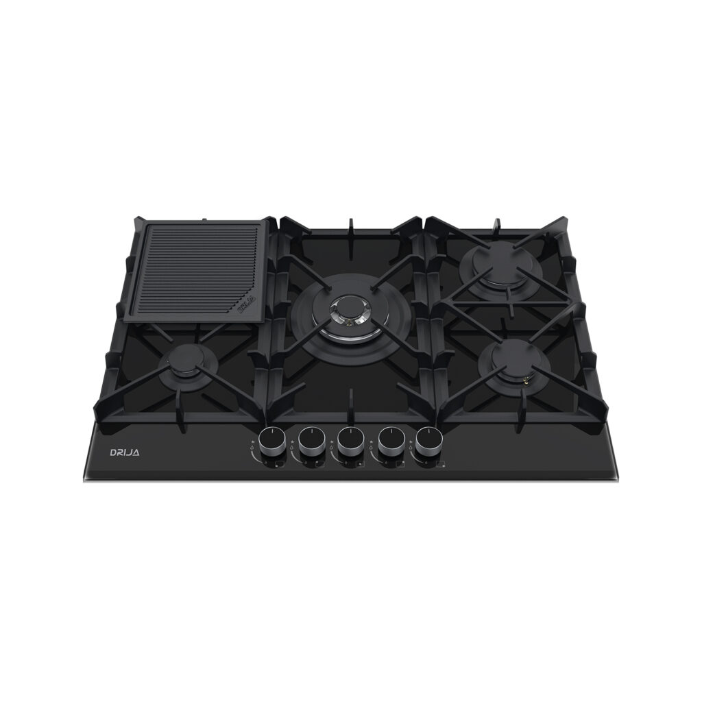 Estufa de 76 cm con elegante superficie de vidrio templado negro de 8 mm, equipada con cinco quemadores SABAF de alta eficiencia y plancha de hierro fundido. Ideal para quienes buscan funcionalidad y sofisticación en espacios medianos.