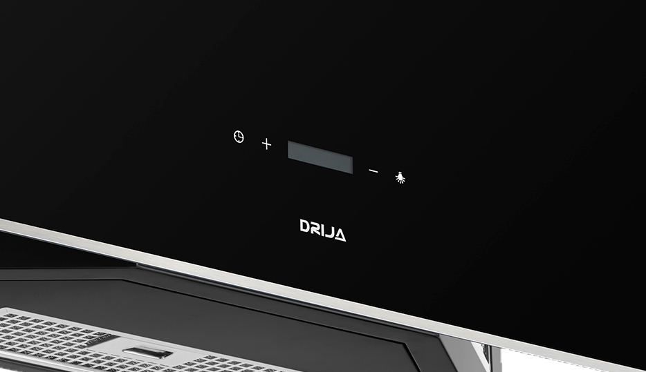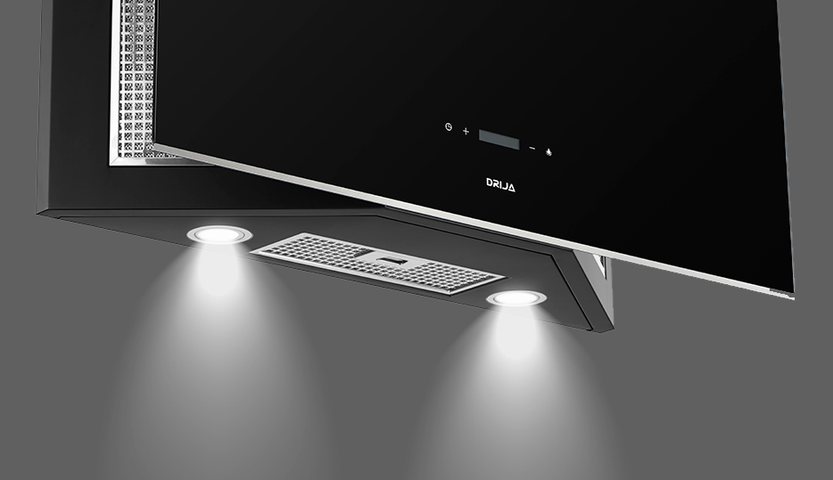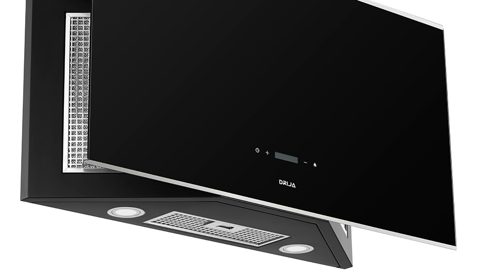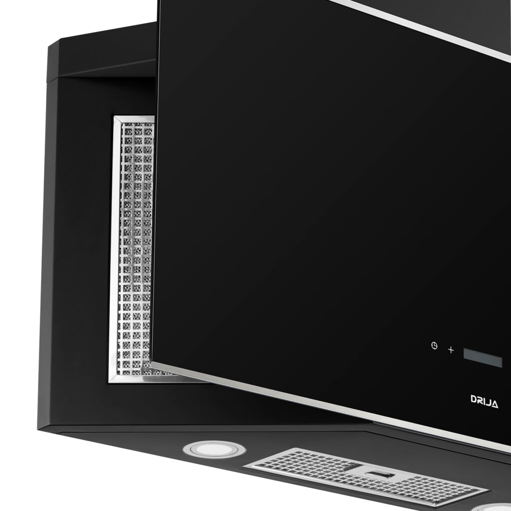 Campana decorativa de 90 cm en vidrio negro templado con bordes de acero. Potente sistema de extracción con triple filtrado, panel digital y diseño moderno inclinado. Ideal para una cocina funcional y elegante.