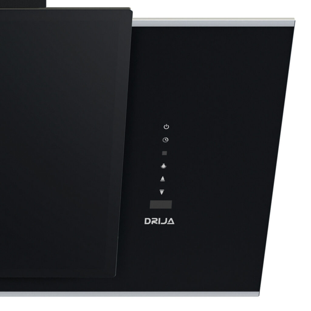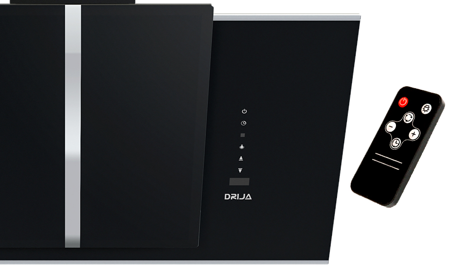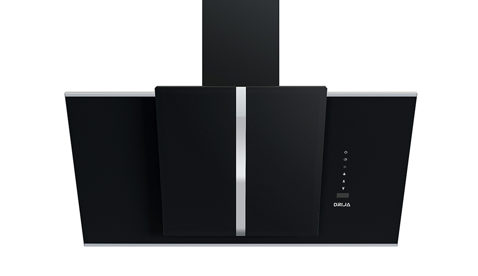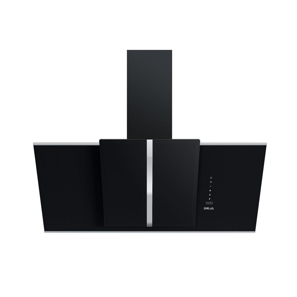 Campana de gran tamaño (90 cm) para cocinas amplias. Integra vidrio templado negro con bordes de acero, temporizador digital, 3 velocidades y doble sistema de filtrado.
