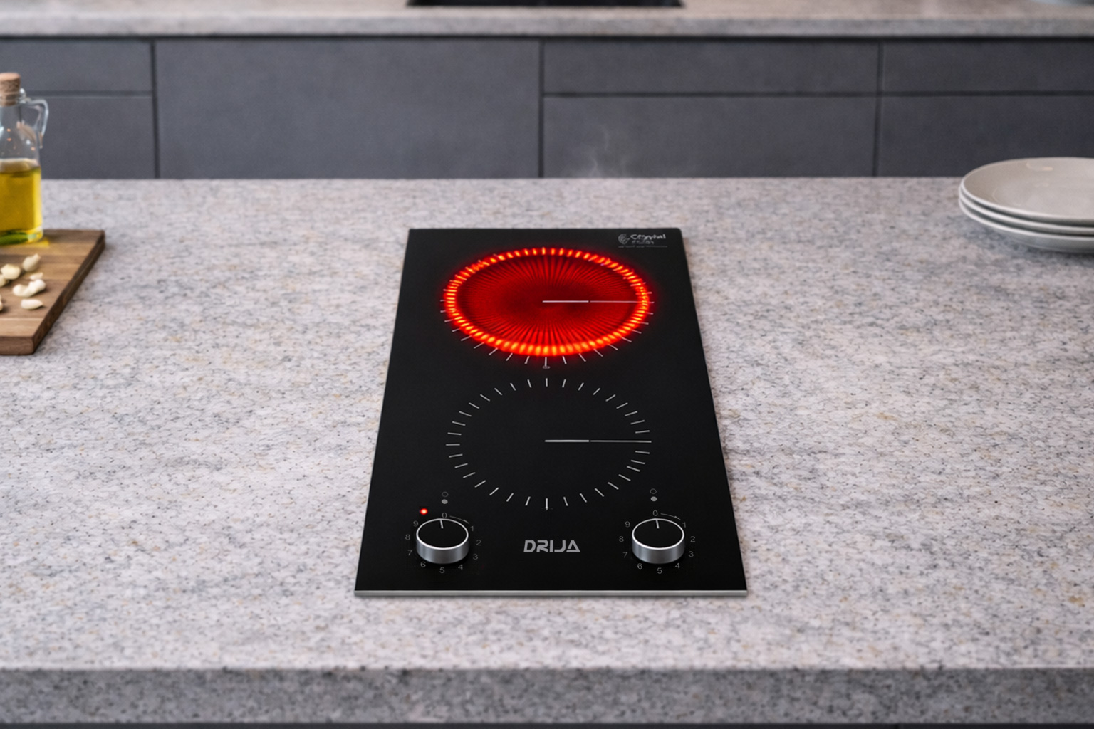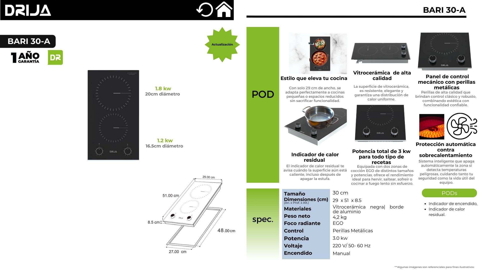 La BARI 30-A es una placa de vitrocerámica compacta de 30 cm, pensada para cocinas modernas donde cada centímetro cuenta. Integra 2 zonas radiantes EGO (1.8 kW de 20 cm y 1.2 kW de 16.5 cm) para cubrir desde cocciones rápidas hasta preparaciones suaves, con una potencia total de 3.0 kW. Su superficie de vitrocerámica negra con borde de aluminio aporta un look limpio y resistente, mientras el control mecánico con perillas metálicas asegura un manejo clásico, directo y confiable. Además, suma seguridad real con protección automática contra sobrecalentamiento e indicador de calor residual para evitar contactos accidentales cuando la zona sigue caliente.