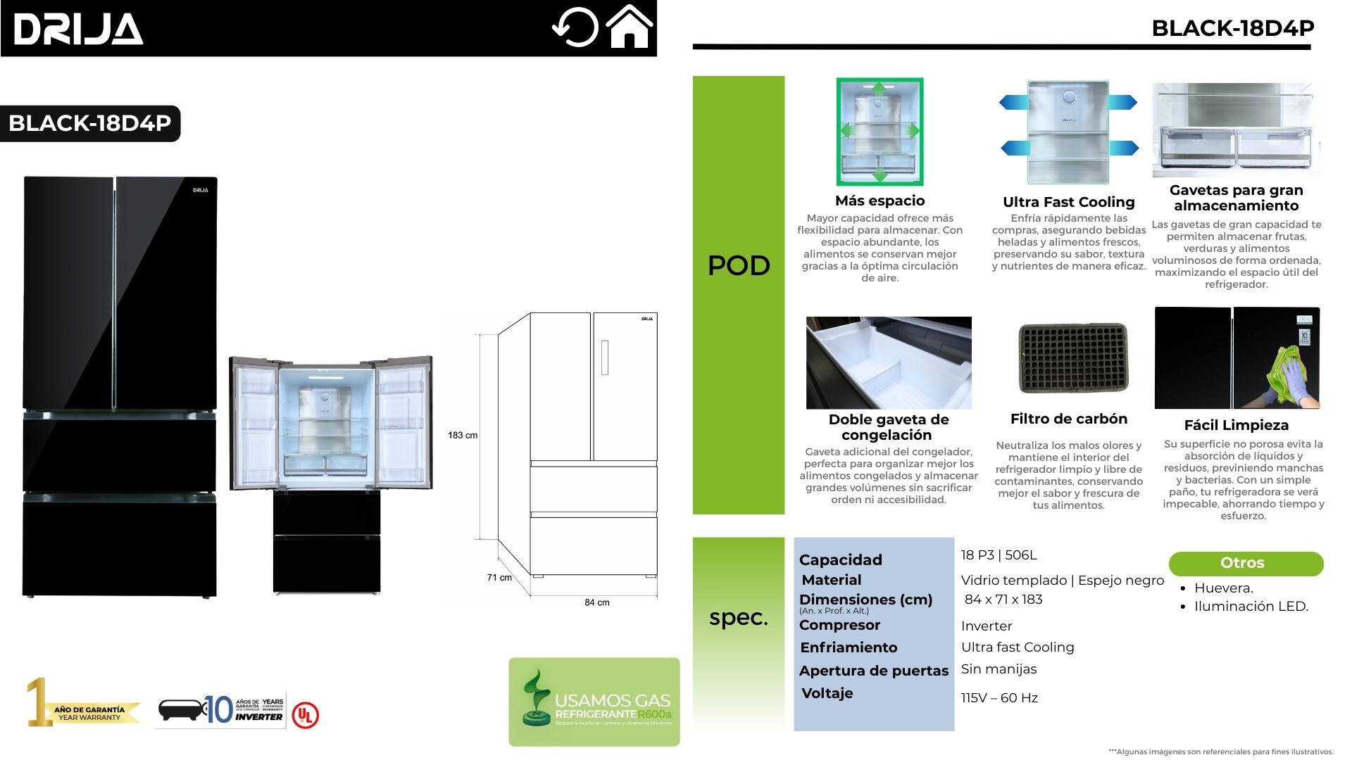 El refrigerador BLACK-18D4P de DRIJA, con diseño French Door y acabado en vidrio templado color negro, combina estilo y capacidad con 18 P³ / 506 L. Cuenta con doble gaveta de congelación para optimizar el almacenamiento, Ultra Fast Cooling para enfriar más rápido y filtro de carbón que conserva la frescura de los alimentos. Sus bandejas de vidrio templado y superficie de fácil limpieza garantizan durabilidad y practicidad en el día a día.