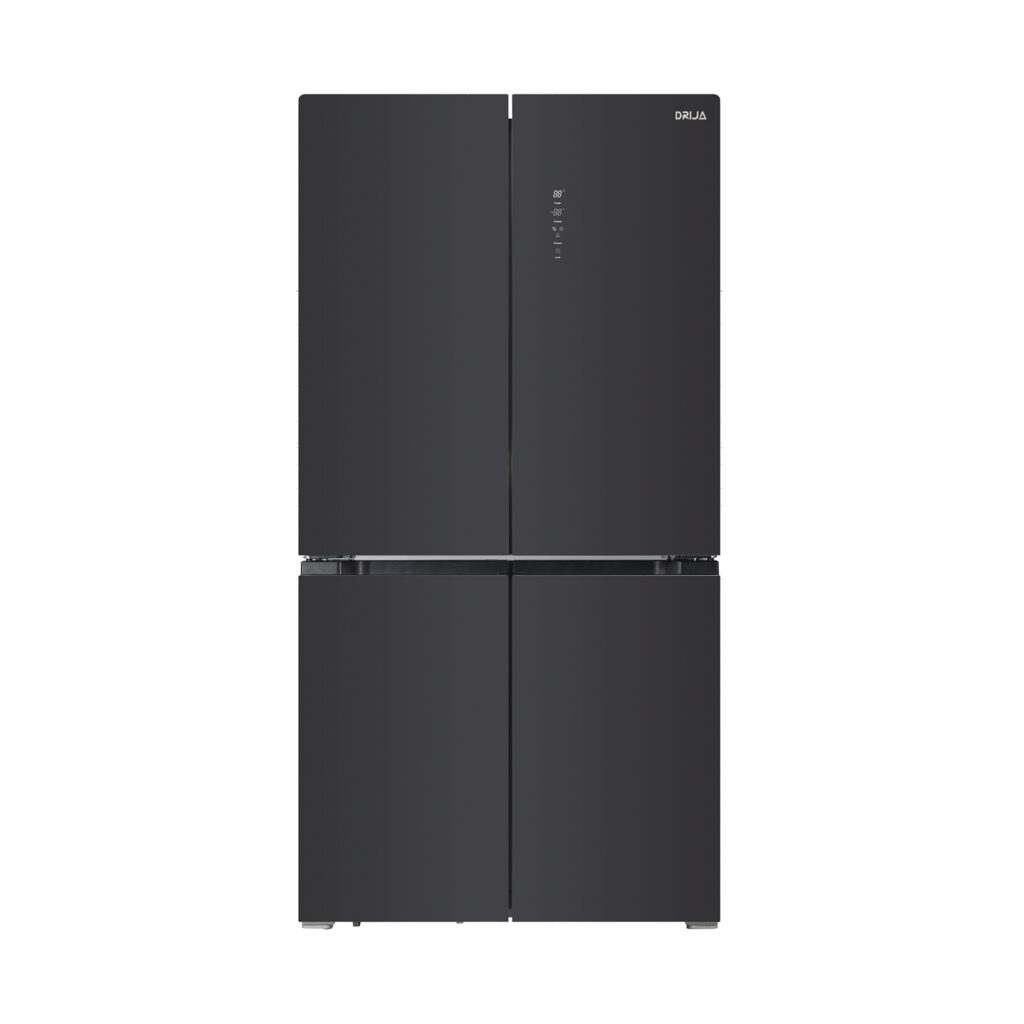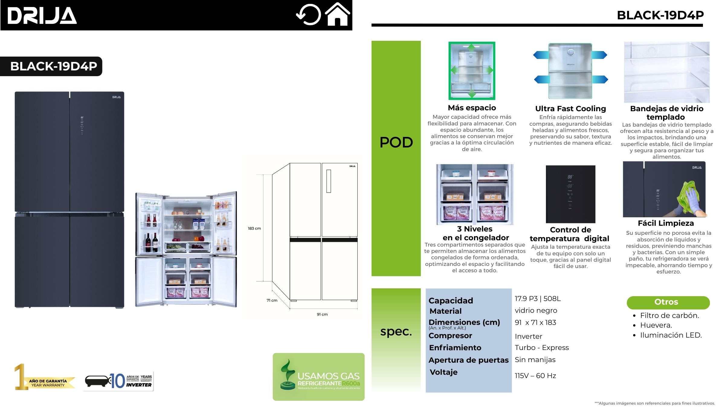 El BLACK-19D4P de DRIJA, con acabado en vidrio templado espejo negro, ofrece una capacidad de 17.9 P³ / 508 L y un diseño French Door con 3 niveles en el congelador para una organización óptima de los alimentos. Su sistema Ultra Fast Cooling garantiza un enfriamiento rápido y eficiente, mientras que las bandejas de vidrio templado y la superficie de fácil limpieza aportan durabilidad y practicidad. Además, cuenta con control de temperatura digital para un ajuste preciso.