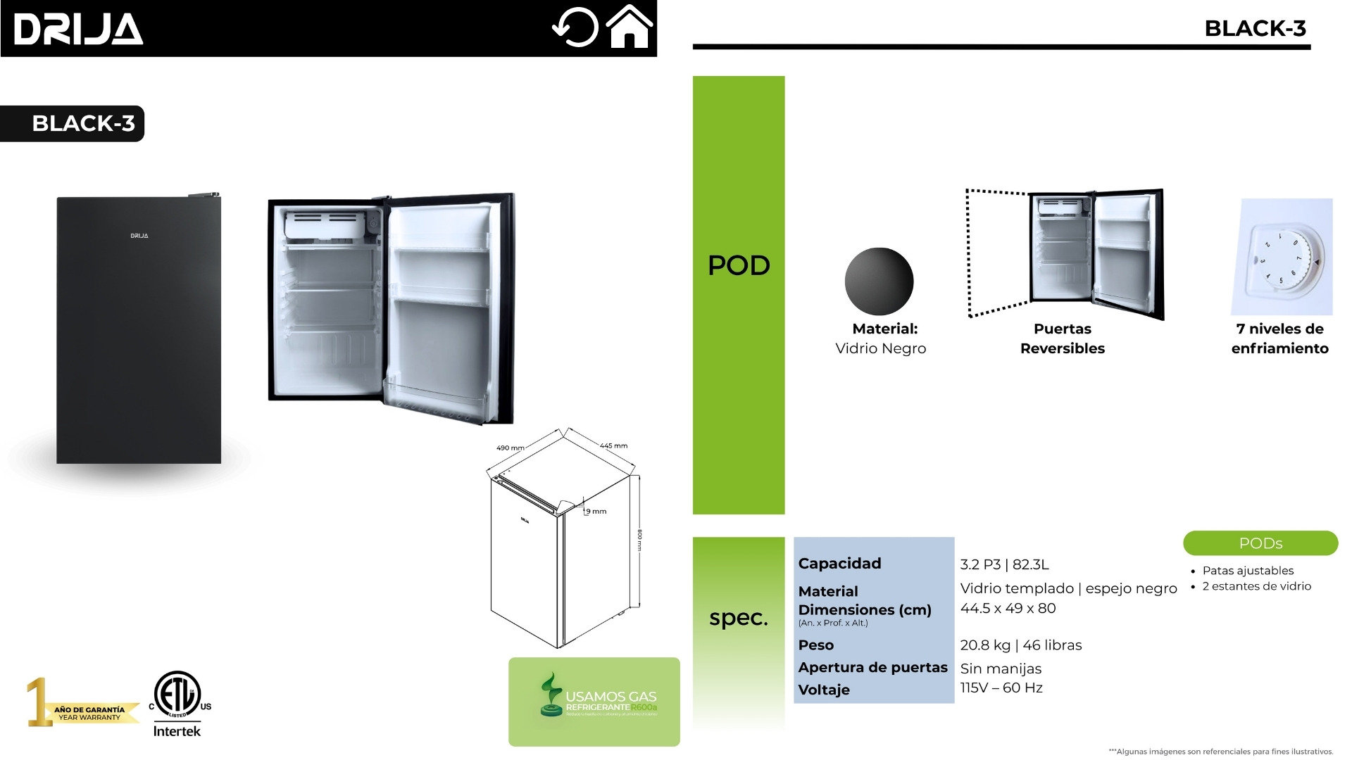 La BLACK-3 de DRIJA es una nevera compacta de 3.2 Pies cúbicos ideal para espacios reducidos como oficinas, estudios o suites. Su diseño con acabado en vidrio negro templado brinda un toque moderno y elegante, mientras que sus puertas reversibles y niveles de enfriamiento ajustables ofrecen total practicidad. Incluye estantes de vidrio templado y patas ajustables para mayor estabilidad.