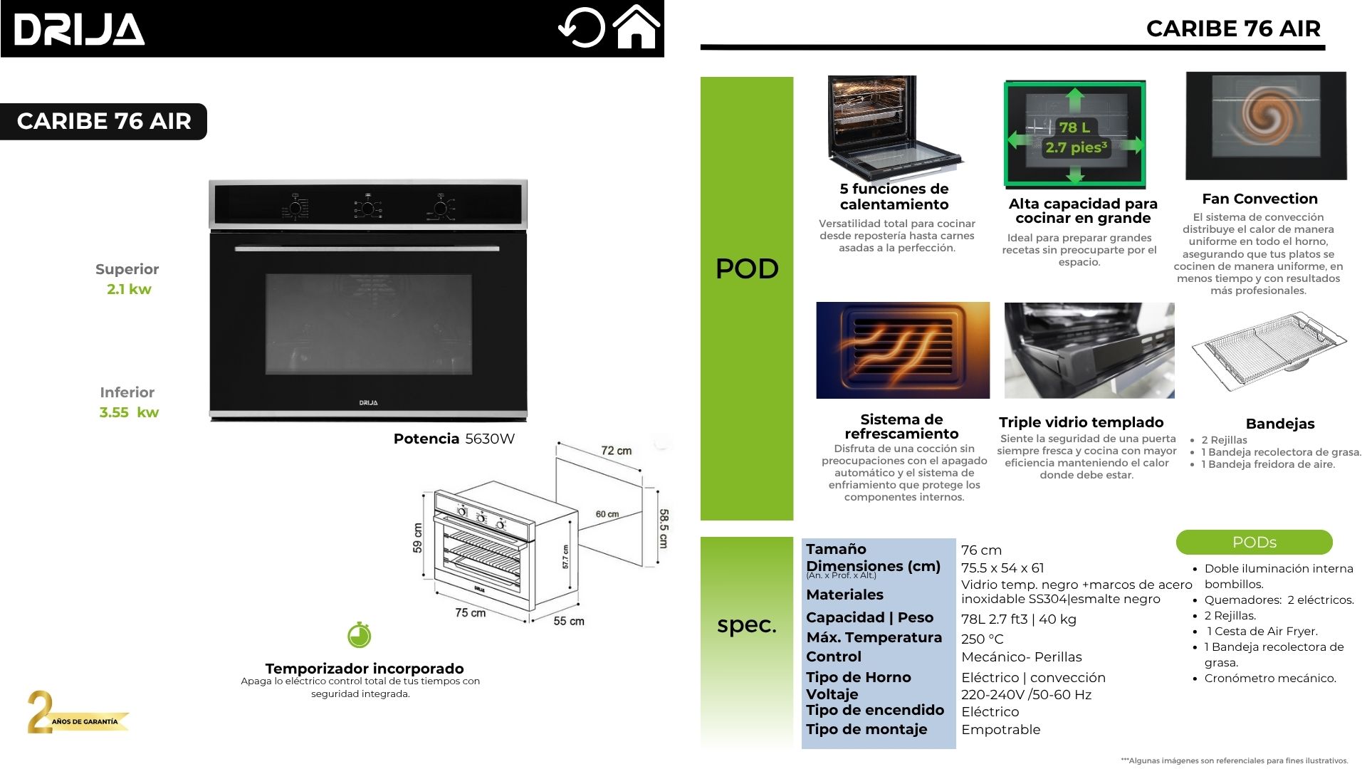 El horno empotrable Caribe 76 Air de DRIJA destaca por su gran capacidad de 105 litros, con un diseño elegante en vidrio negro y potentes funciones para todo tipo de preparaciones. Integra sistema de convección con quemador para lograr una cocción más rápida y uniforme, ideal para familias que cocinan a gran escala. Sus 5 funciones de calentamiento, triple vidrio de seguridad y accesorios especializados como la bandeja para freidora de aire, lo convierten en un aliado versátil, potente y confiable en cualquier cocina moderna.