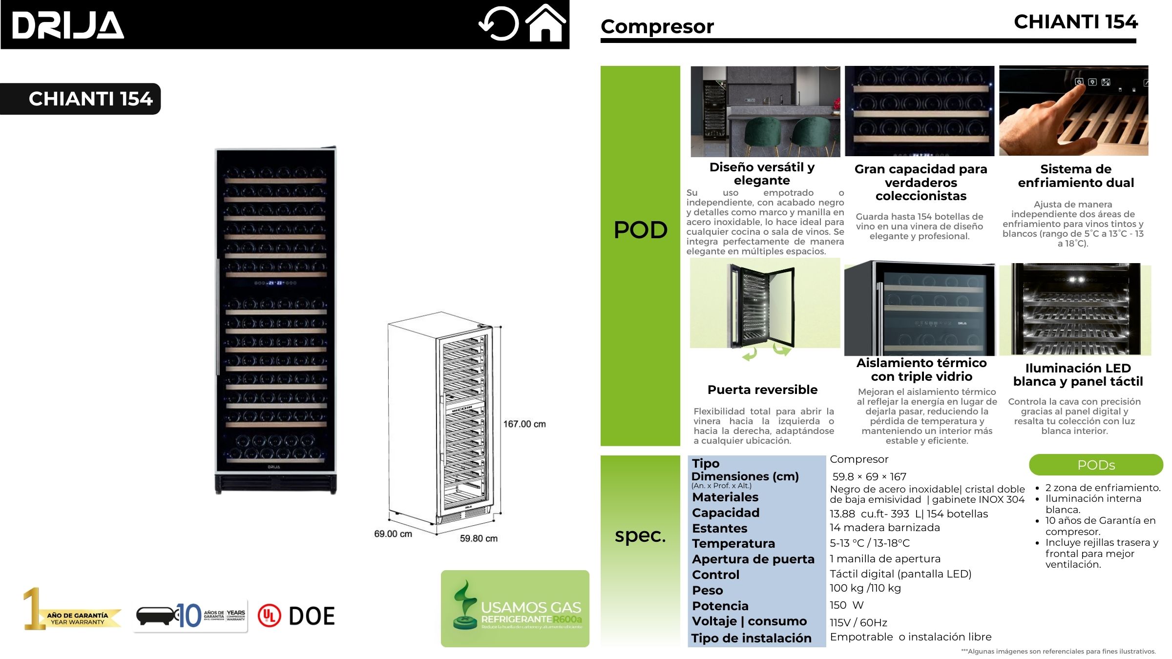 La vinera Chianti 154 de DRIJA es una cava de gran formato, diseñada para verdaderos coleccionistas. Su capacidad para 154 botellas, doble zona de enfriamiento y estantes de madera barnizada permiten organizar tu colección con orden, elegancia y tecnología. Incorpora puerta de acero inoxidable con doble vidrio, iluminación LED blanca, control táctil y sistema de instalación flexible, ideal para empotrar o ubicar de forma independiente.
