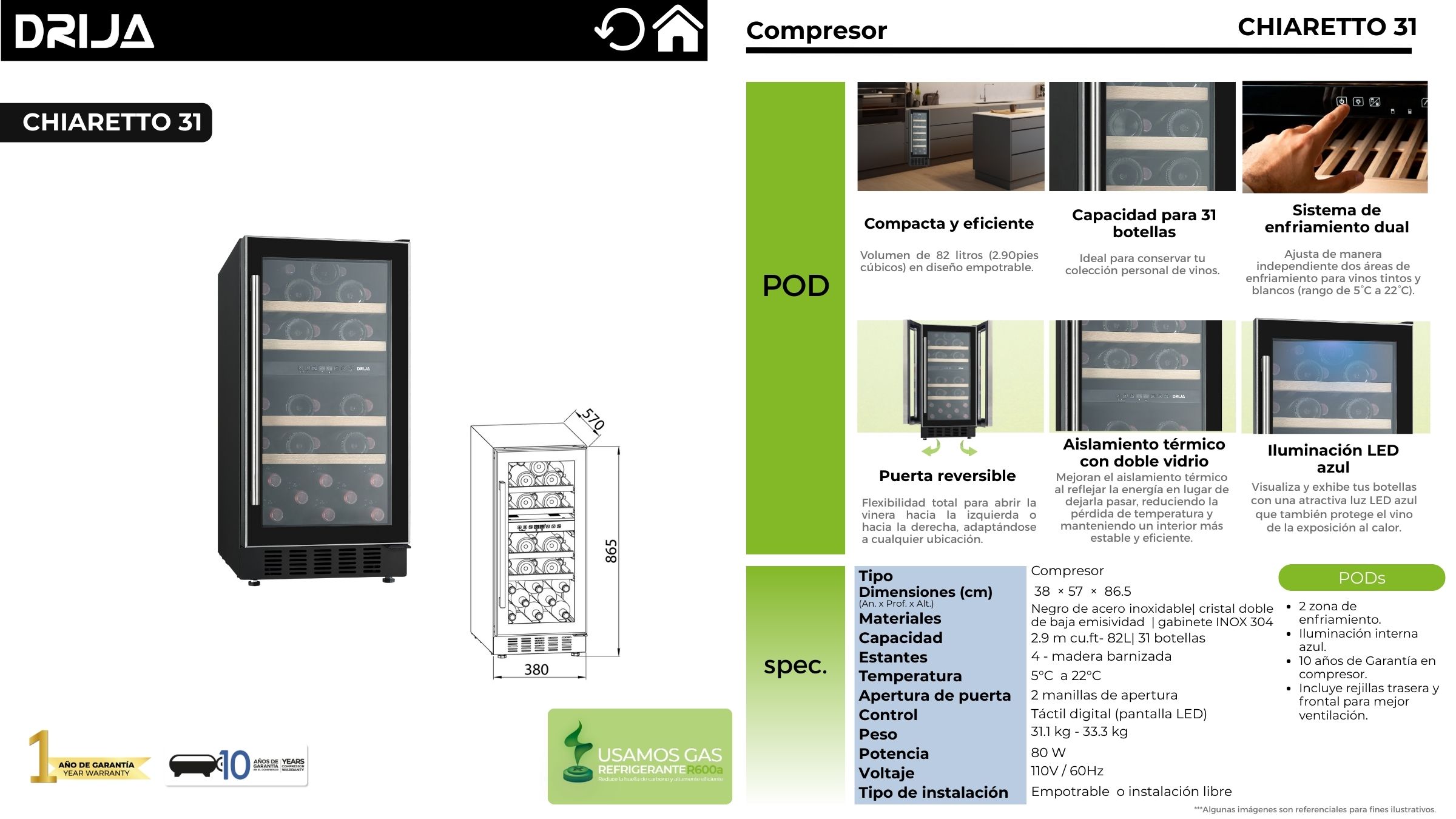 | Capacidad | 2.9 ft³ – 82 L | 31 botellas |