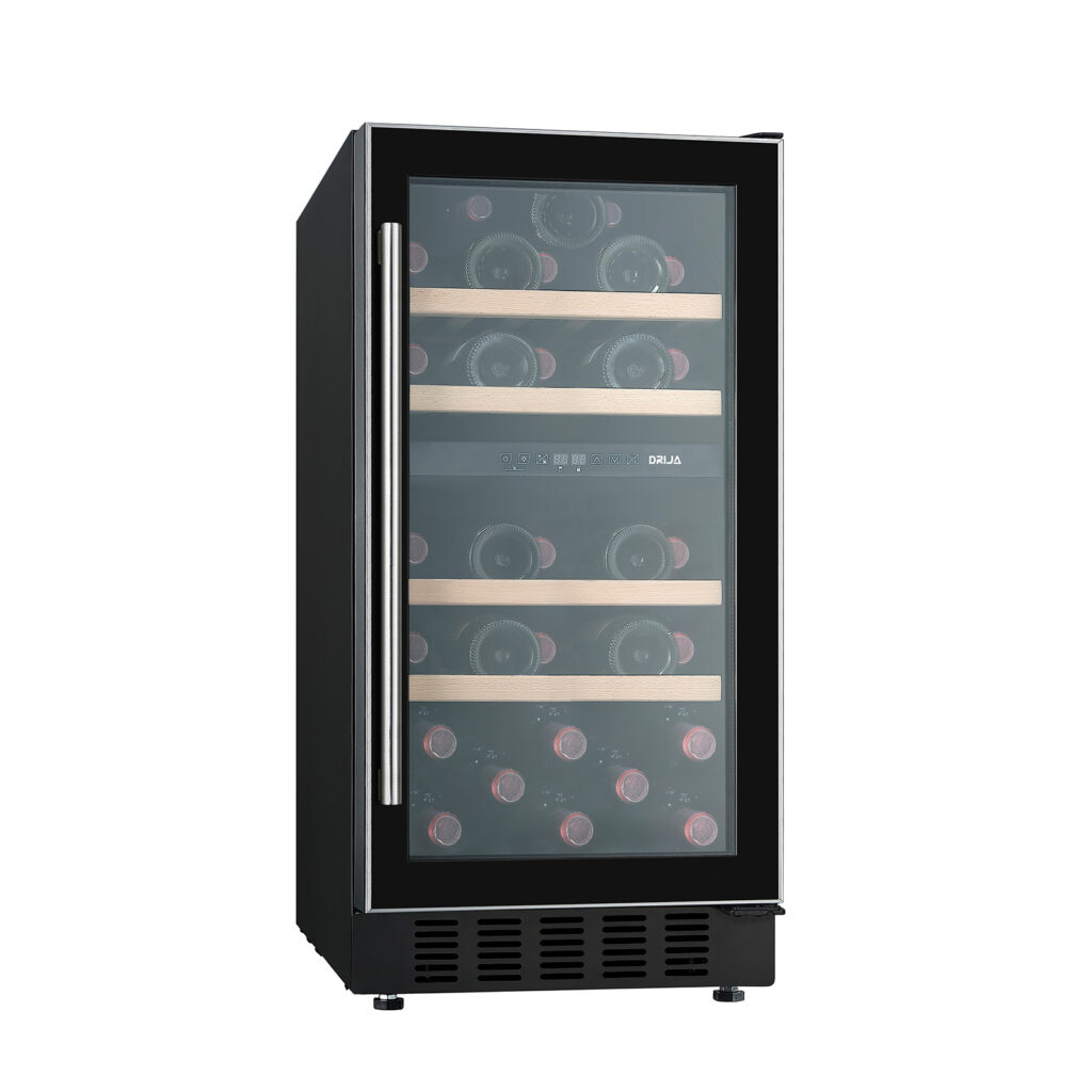 La vinera Chiaretto 31 de DRIJA destaca por su capacidad, diseño compacto y doble zona de temperatura, permitiéndote conservar diferentes tipos de vinos en condiciones ideales. Con estantes deslizables de madera barnizada, iluminación LED azul, control digital y puerta reversible de doble vidrio con acero inoxidable, es perfecta tanto para cocinas modernas como para espacios gourmet. Su eficiencia y elegancia la convierten en una opción completa y sofisticada.