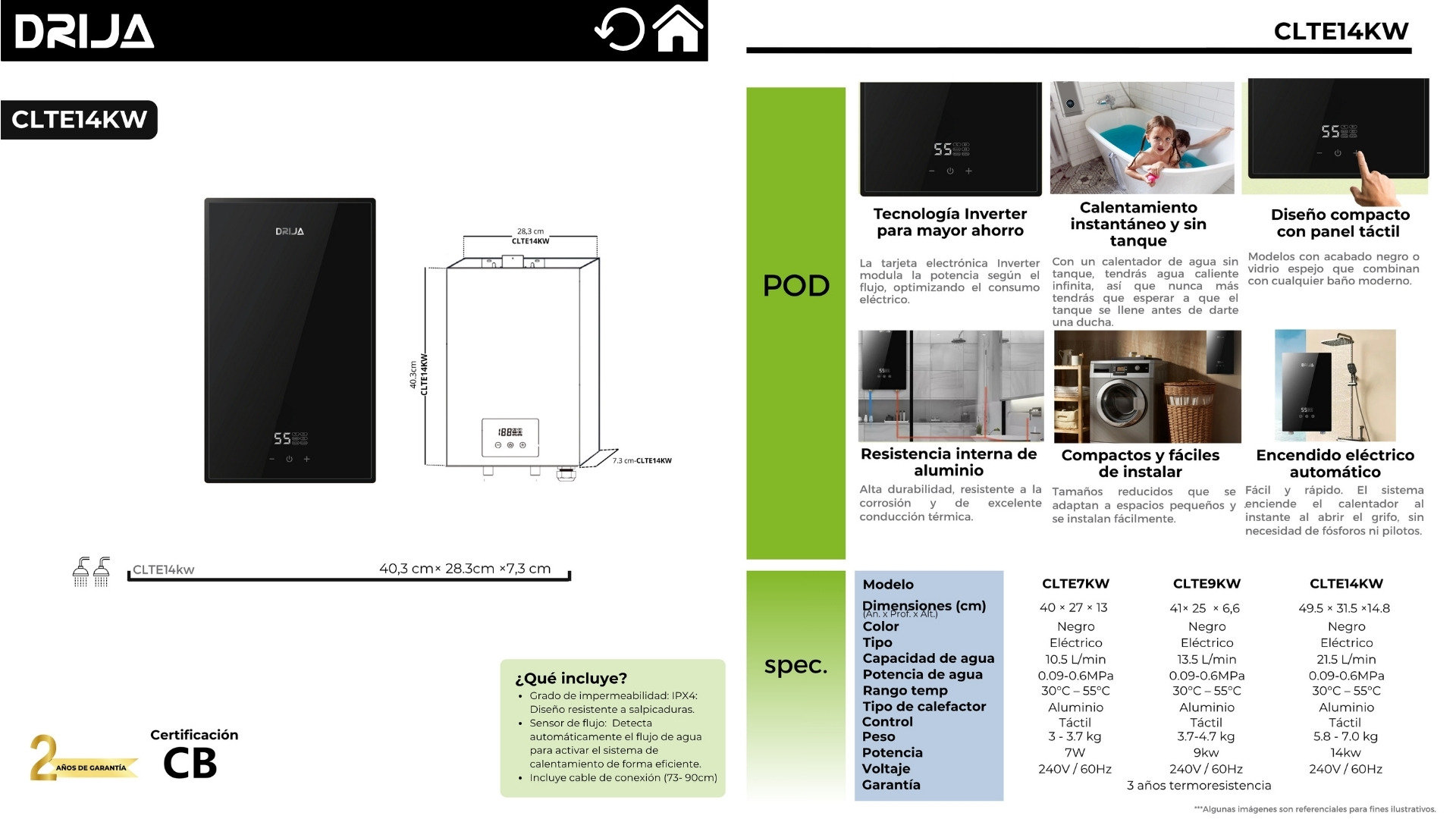 El CLTE14KW de DRIJA es un calentador de agua eléctrico de alto rendimiento con tecnología Inverter, que ajusta automáticamente la potencia según el flujo de agua para optimizar el consumo eléctrico. Su diseño compacto con panel táctil aporta un toque moderno y elegante a cualquier baño. Ofrece calentamiento instantáneo sin tanque, resistencia interna de aluminio para mayor durabilidad y encendido eléctrico automático para un uso seguro y práctico.