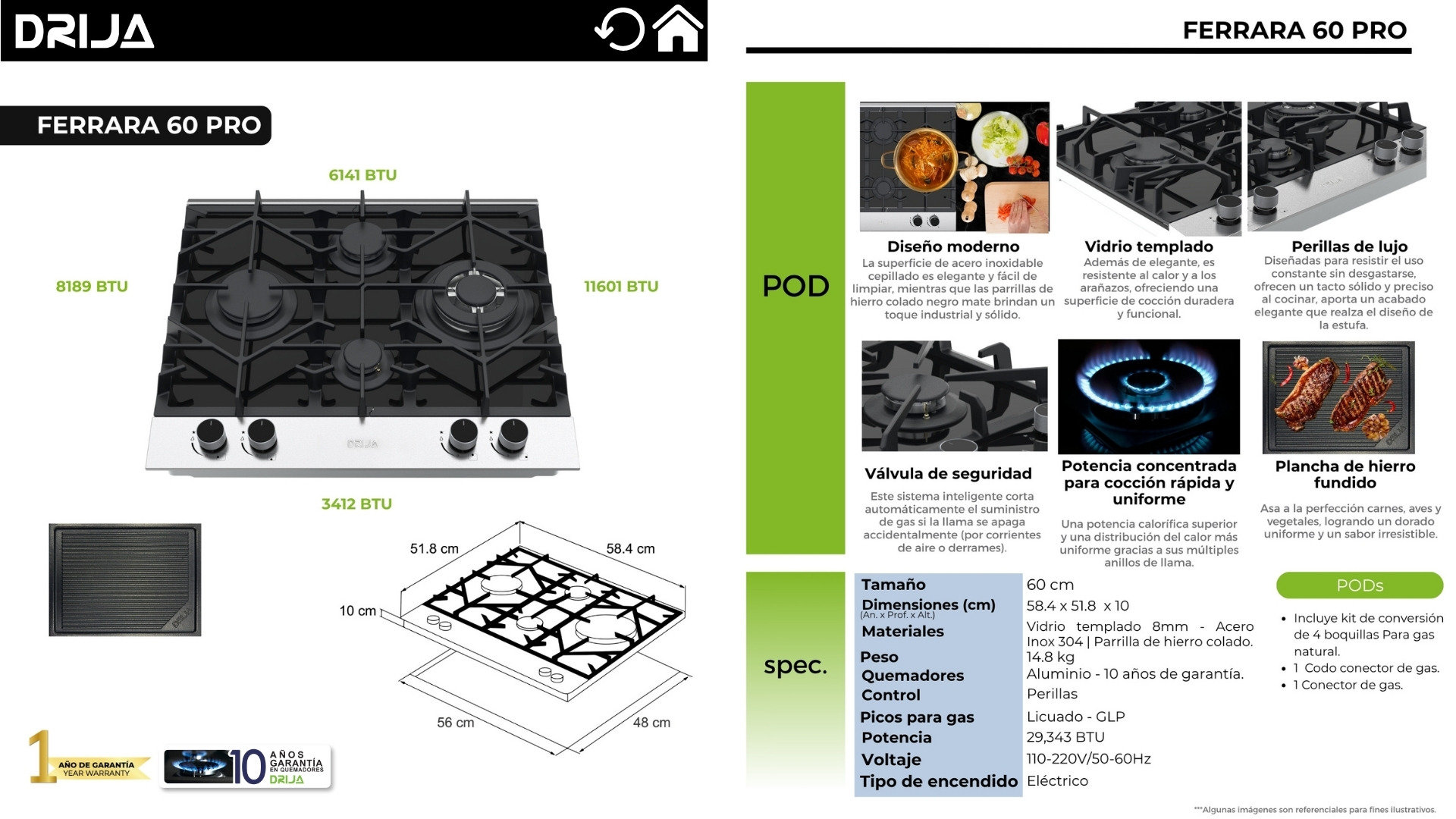 | Materiales | Vidrio templado 8mm + Acero Inox 304 | Parrillas de hierro colado |