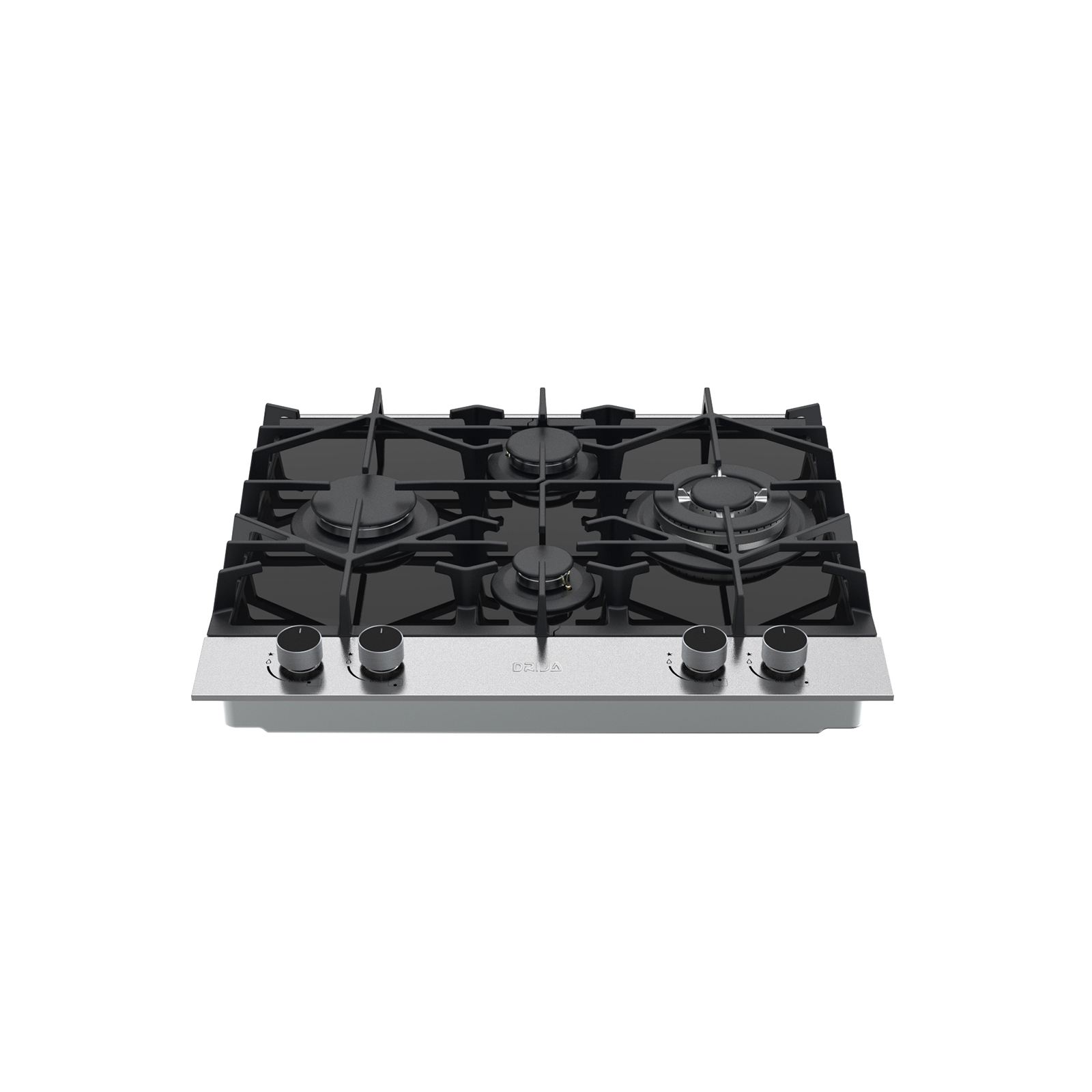 Estufa de empotrar de 60 cm con elegante superficie combinada de acero inoxidable cepillado y vidrio templado negro de 8 mm. Equipada con cinco quemadores de aluminio SABAF y parrillas de hierro colado, ofrece durabilidad, diseño moderno y una cocción precisa en todo momento.