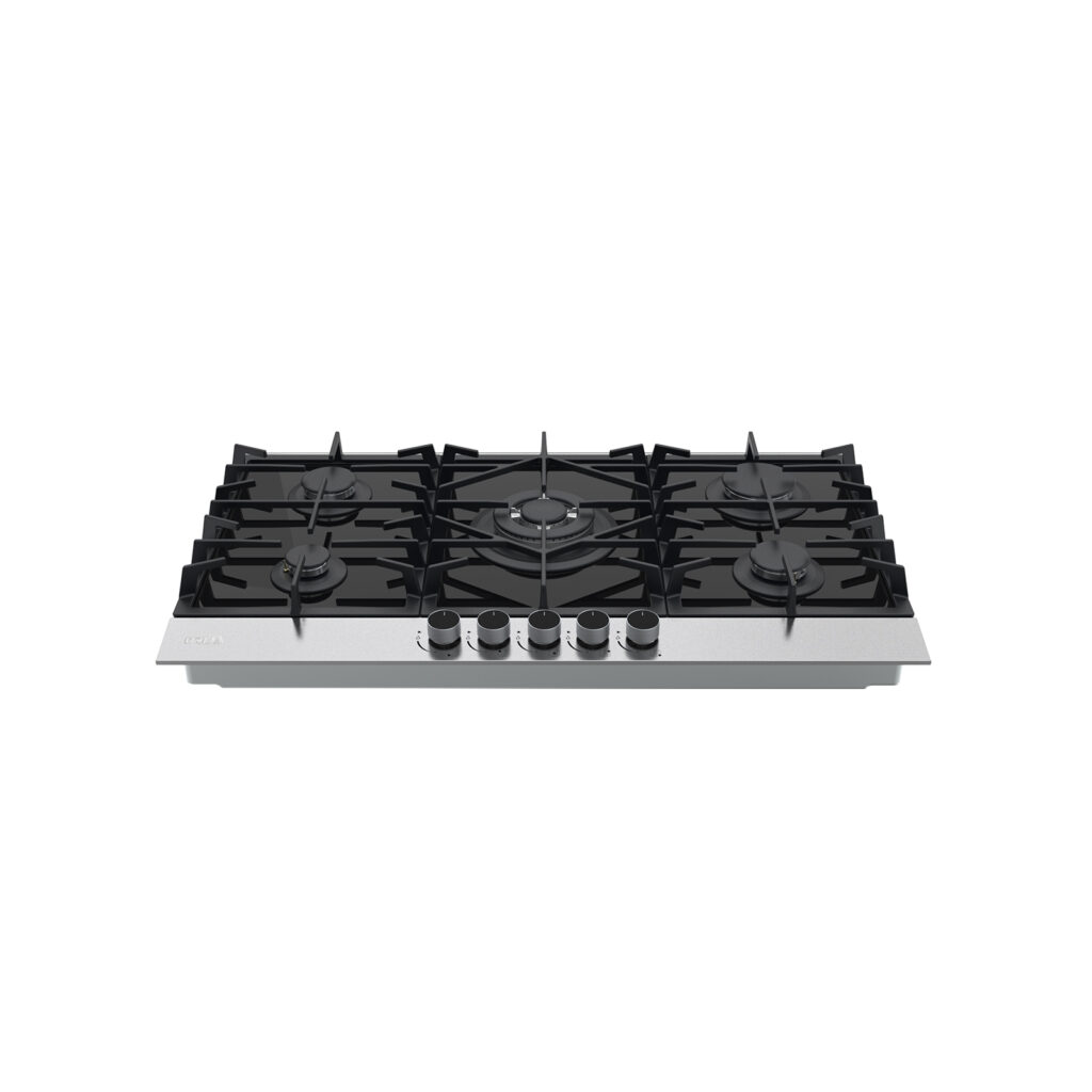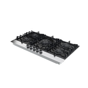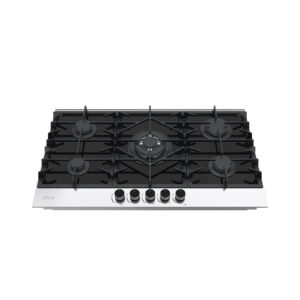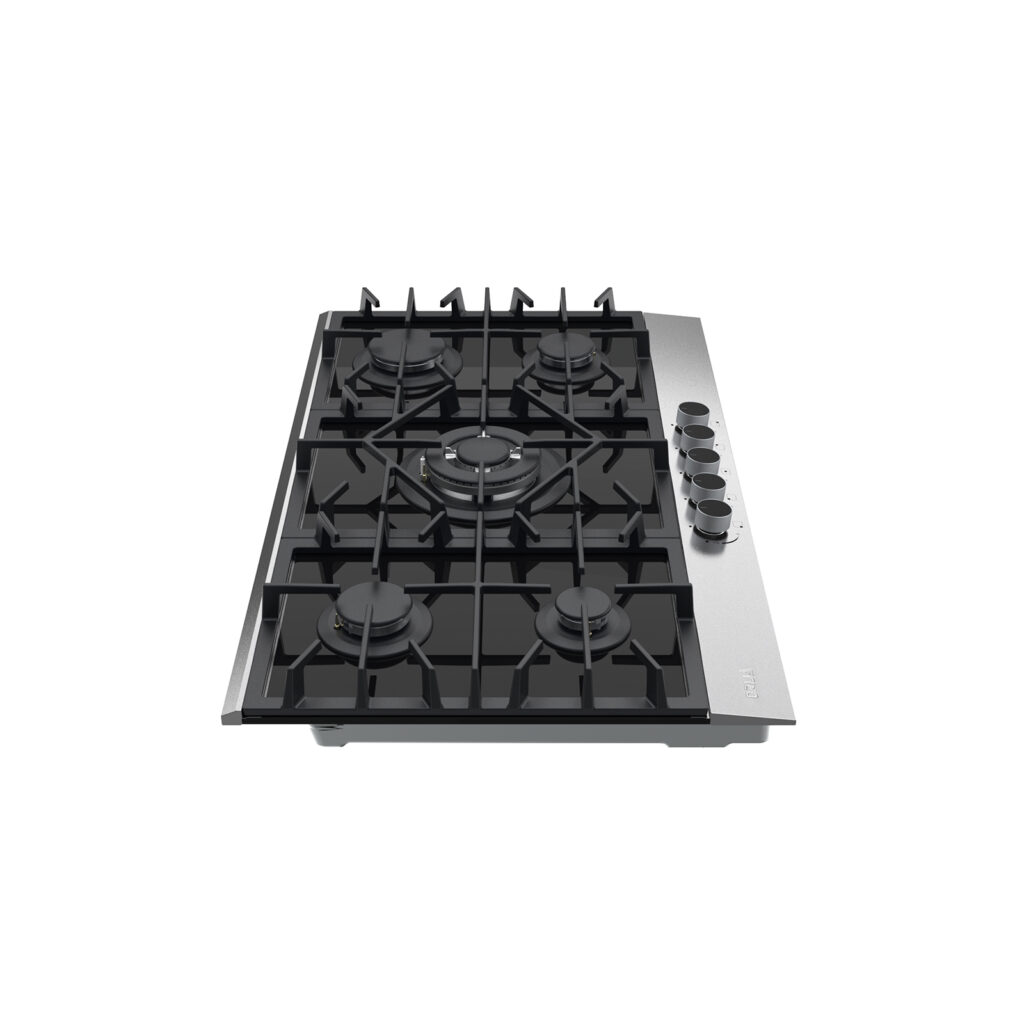 Elegante superficie en acero inoxidable cepillado que facilita la limpieza, acompañada de parrillas de hierro colado negro mate que dan un acabado profesional.