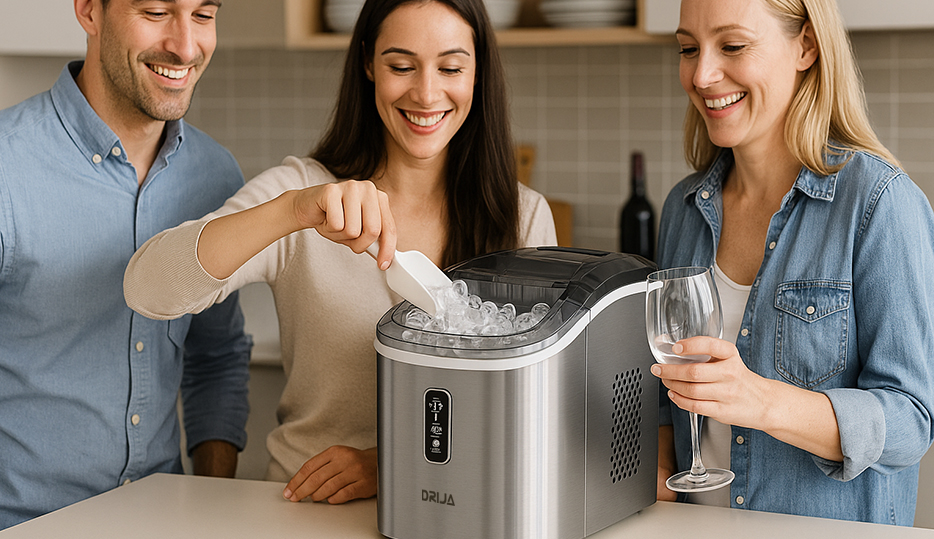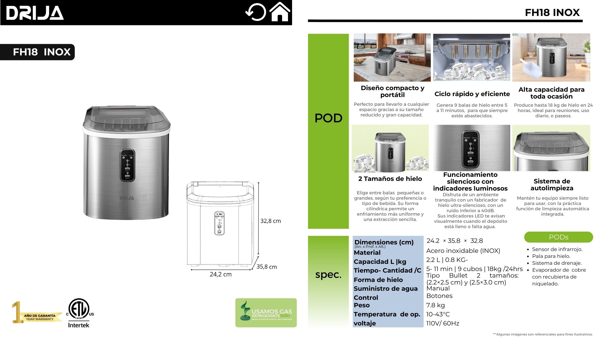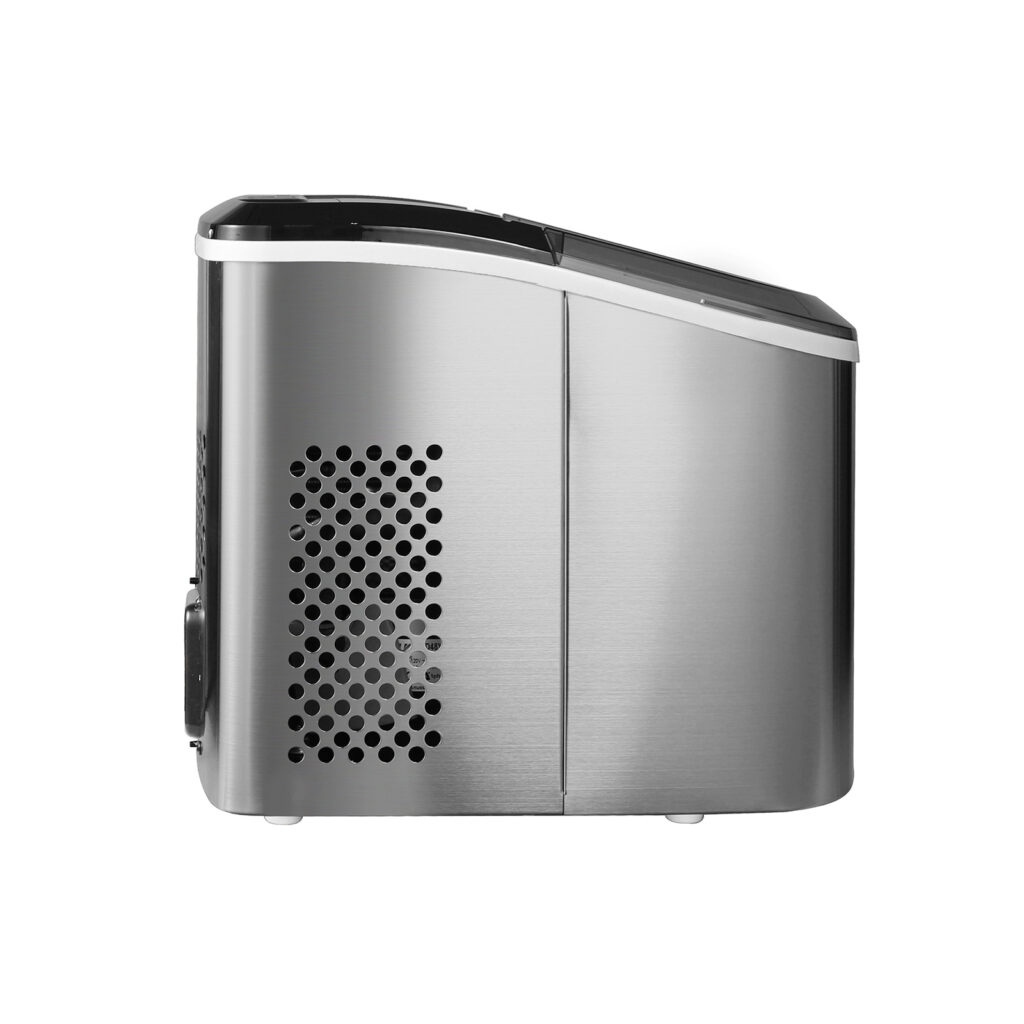 La FH18 INOX de DRIJA es una máquina de hielo portátil con diseño compacto en acero inoxidable, ideal para el hogar, oficinas o eventos. Con capacidad de producción de hasta 18 kg en 24 horas, ofrece dos tamaños de cubos cilíndricos, ciclo rápido de 5 a 11 minutos y sistema de autolimpieza para un mantenimiento sencillo. Su funcionamiento silencioso y panel con indicadores LED garantizan comodidad y practicidad.