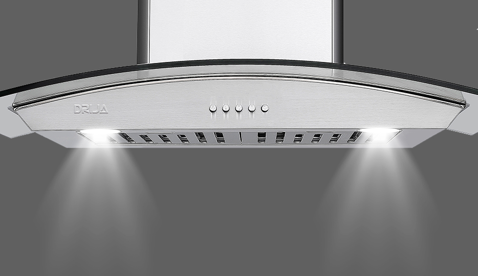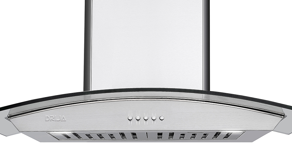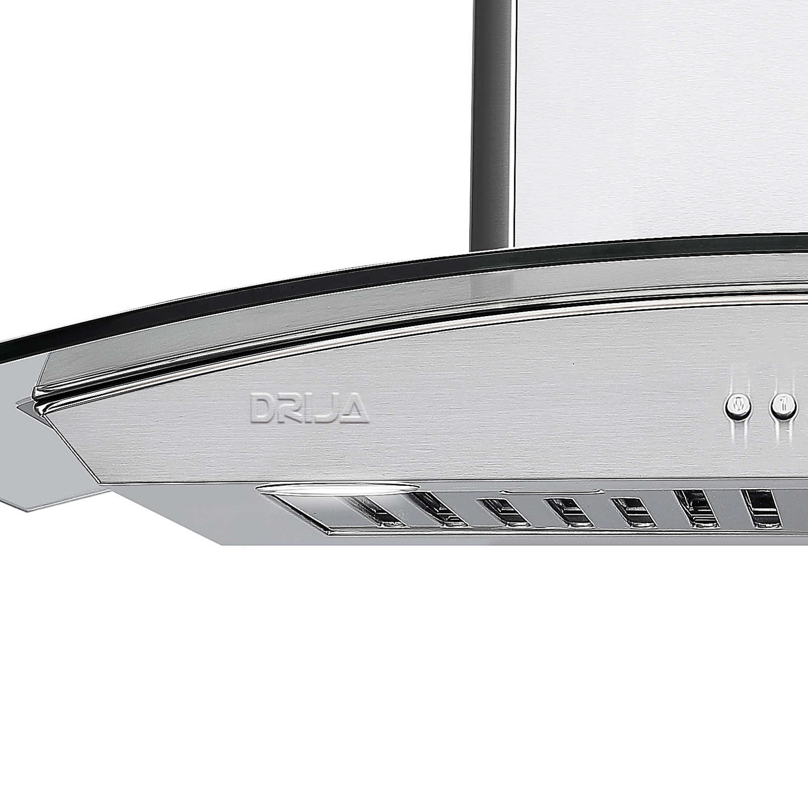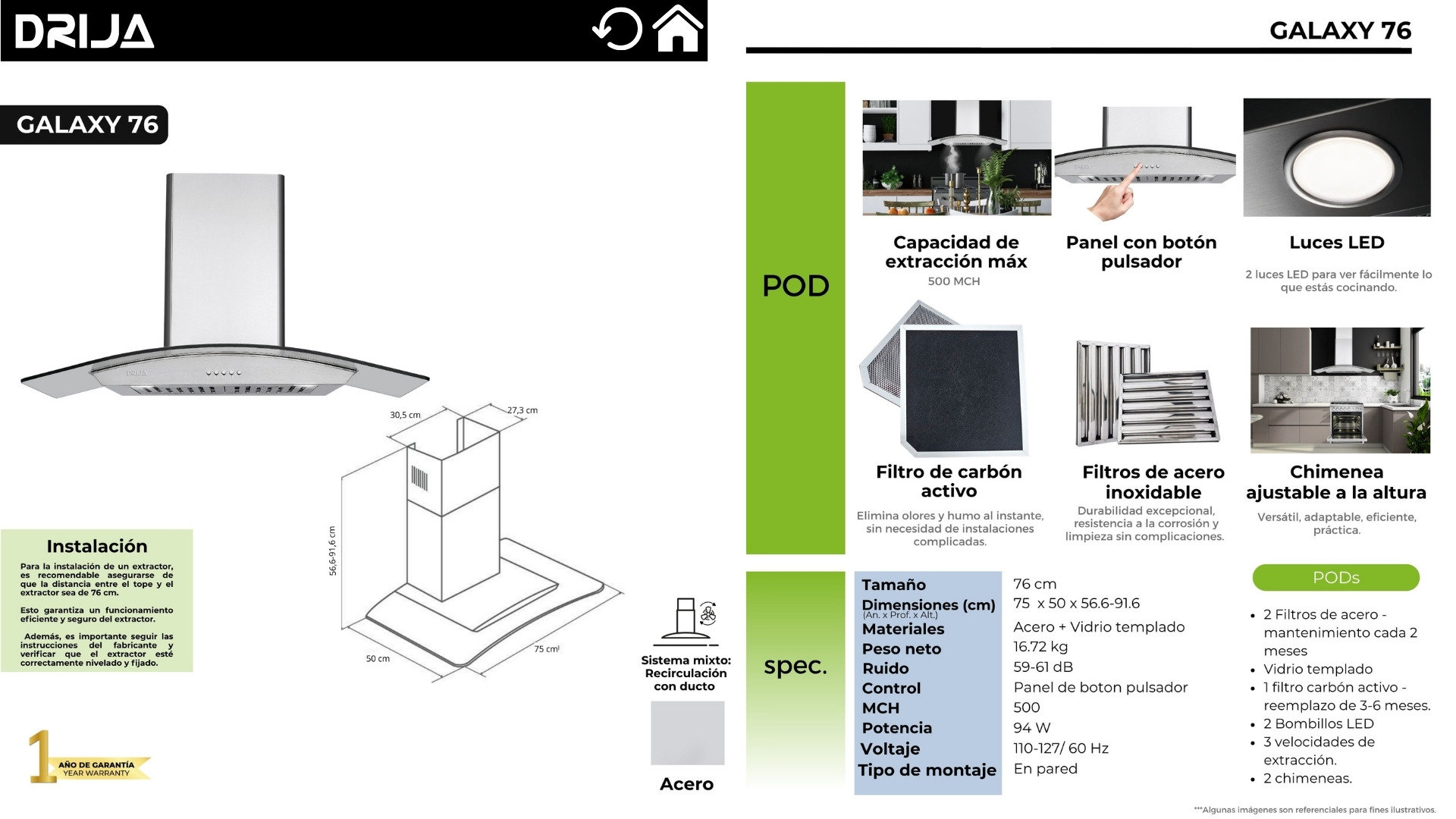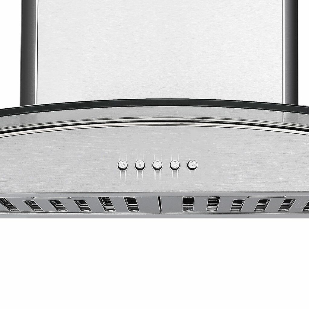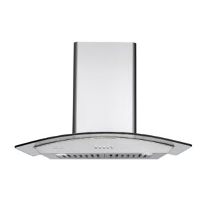 Campana decorativa de 76 cm en acero y vidrio templado curvo. Cuenta con panel de botones, doble sistema de filtrado, luces LED y diseño con chimenea ajustable. Ideal para cocinas modernas con estilo y funcionalidad.