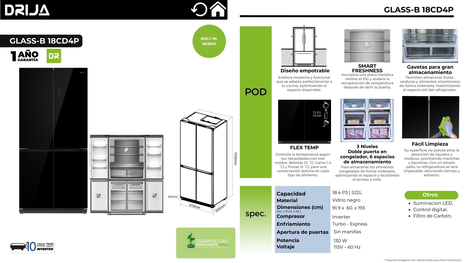 El refrigerador GLASS-B 18CD4P combina un diseño empotrable con acabado en vidrio negro para integrarse limpio y elegante en cocinas modernas. Su sistema Turbo – Express con compresor Inverter mejora la estabilidad de temperatura y acelera el enfriamiento, mientras el interior ofrece bandejas de vidrio templado resistentes y un congelador organizado en 3 niveles, con doble puerta y 6 espacios de almacenamiento para mantener todo en orden. Además, su superficie facilita la limpieza diaria y ayuda a conservar una apariencia impecable por más tiempo.